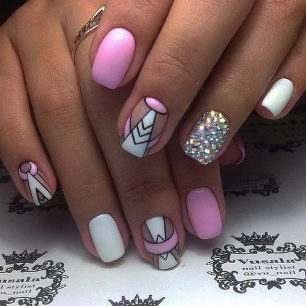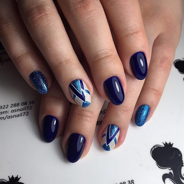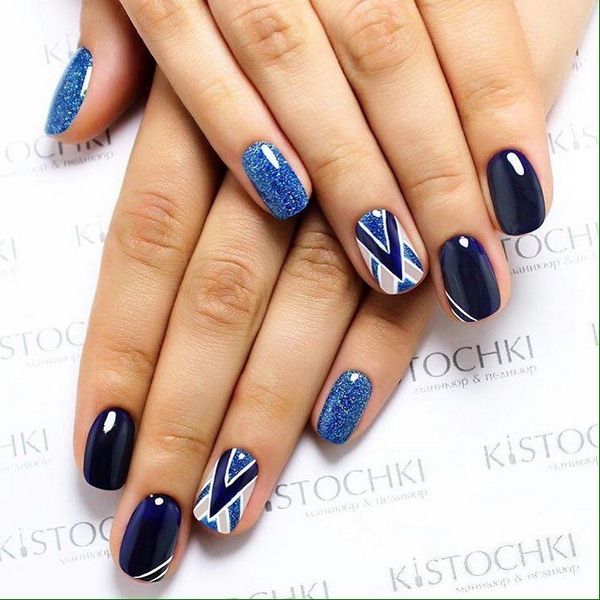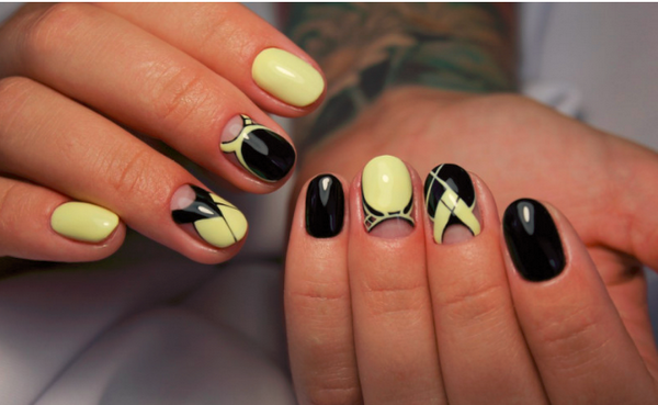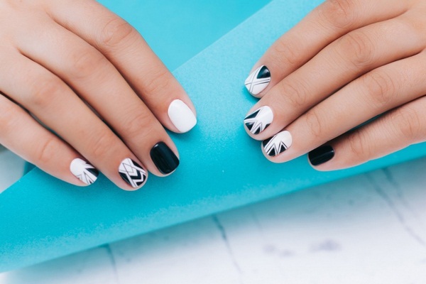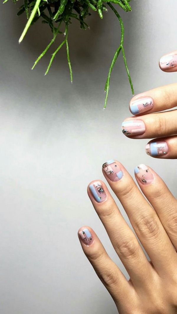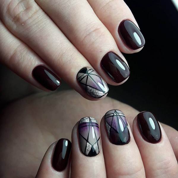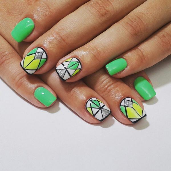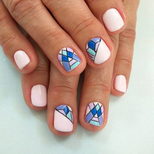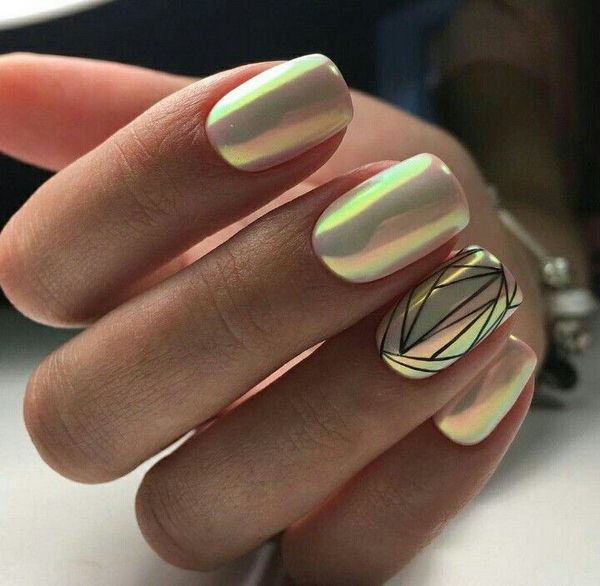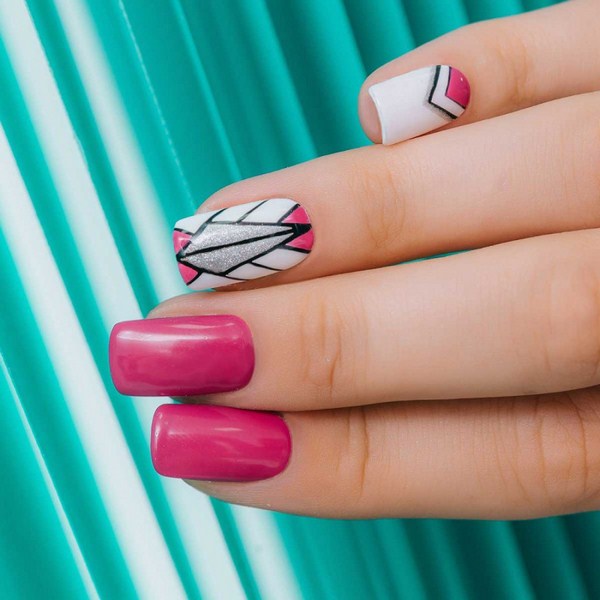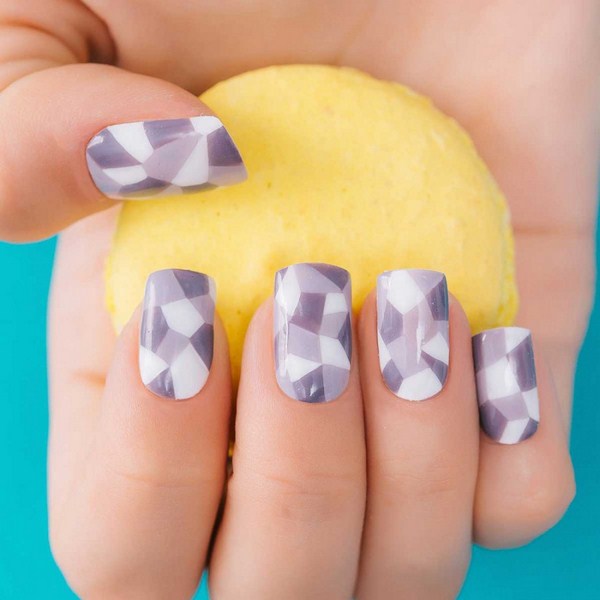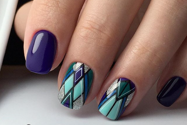 Le nail art géométrique a de nombreuses représentations, dont l’une est une manucure en verre brisé, imitant des fragments de verre à la surface de la plaque à ongles.