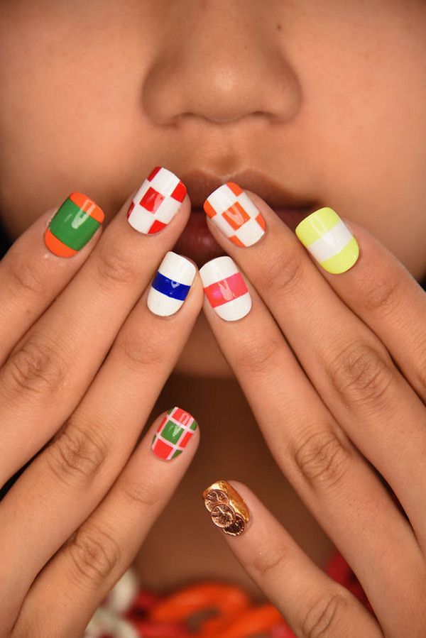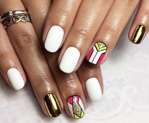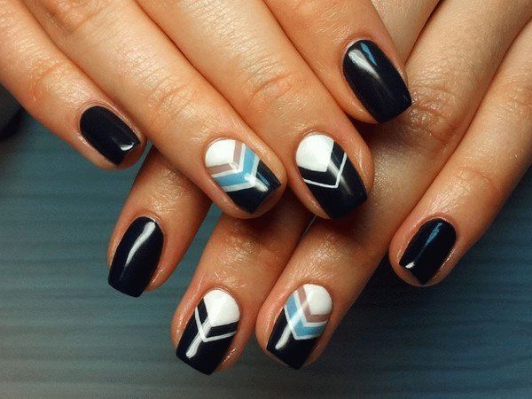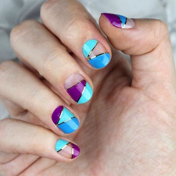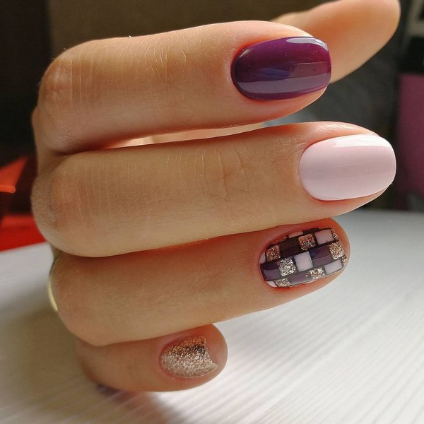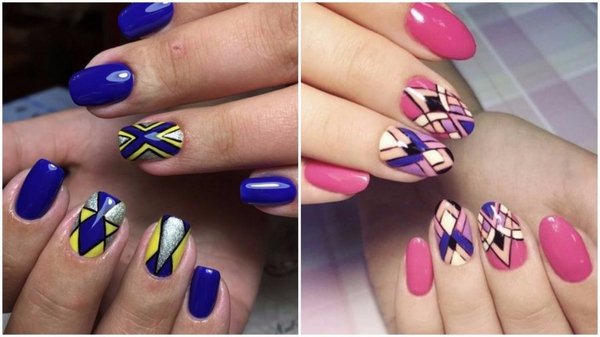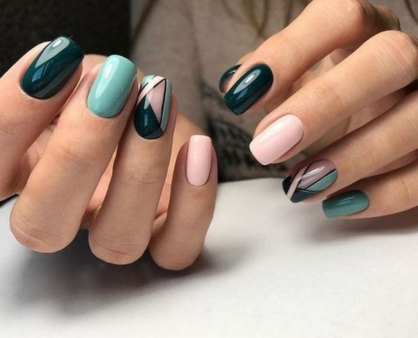 Une manucure de bloc de couleur géométrique intéressante, faite avec beaucoup de petits secteurs de couleurs différentes sur deux doigts, ou un clou divisé en trois secteurs, en deux ou trois couleurs sur tous les doigts.