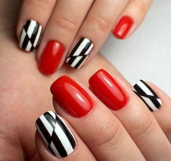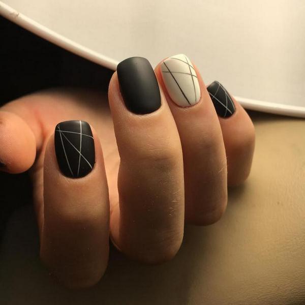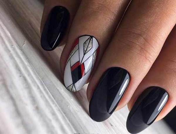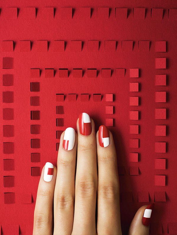 Nous vous suggérons de réaliser une géométrie de manucure haut de gamme en utilisant des tons noirs, rouges et blancs mats, qui sont plus efficaces sur des ongles de longueurs et de formes différentes.