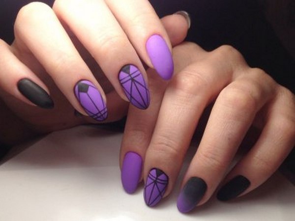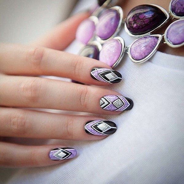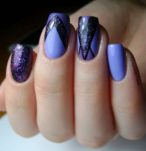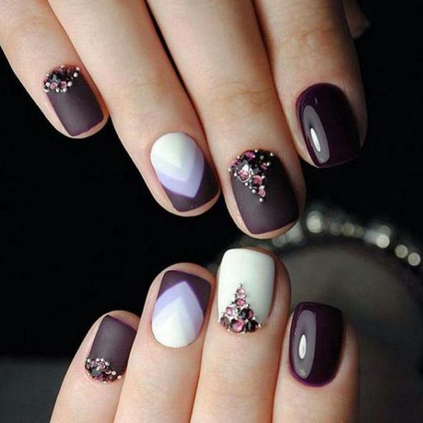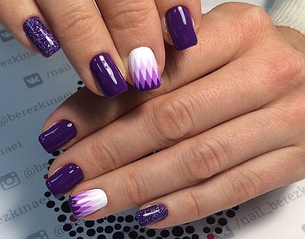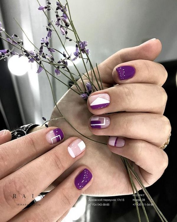 Les experts en manucure ont présenté les meilleures idées d’ombre géométrique dans une nuance magique de vernis violet, complétée par un ton blanc, des pierres et des étincelles.