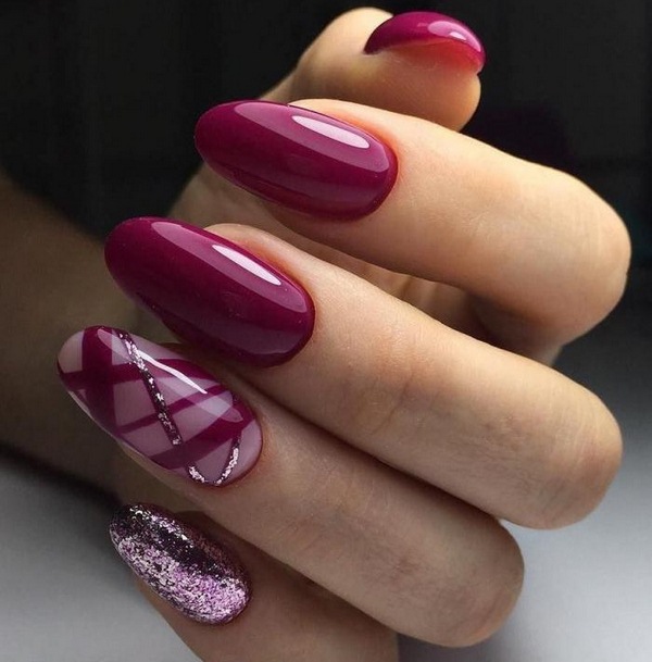Assez souvent, la manucure en blocs de couleurs géométriques est présentée en couleurs vives et saturées: vous pouvez utiliser deux nuances, en les complétant avec des secteurs et des rayures transparents.