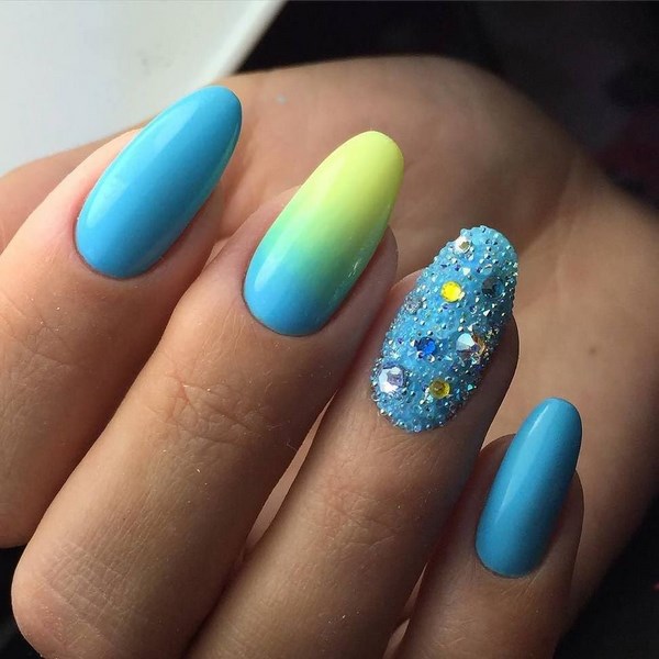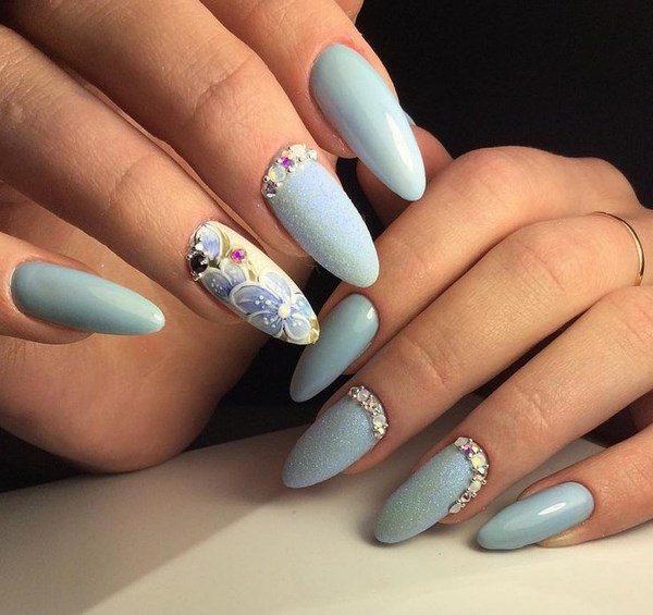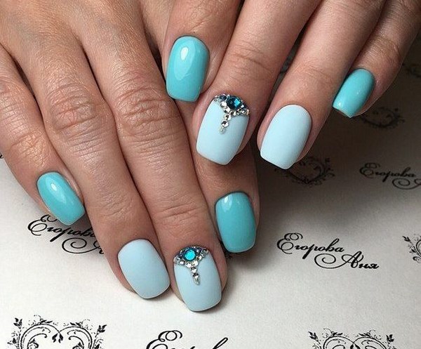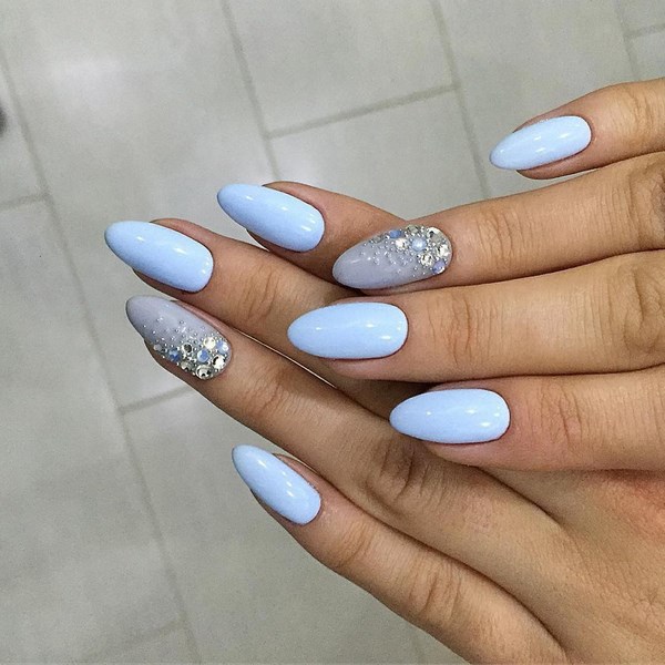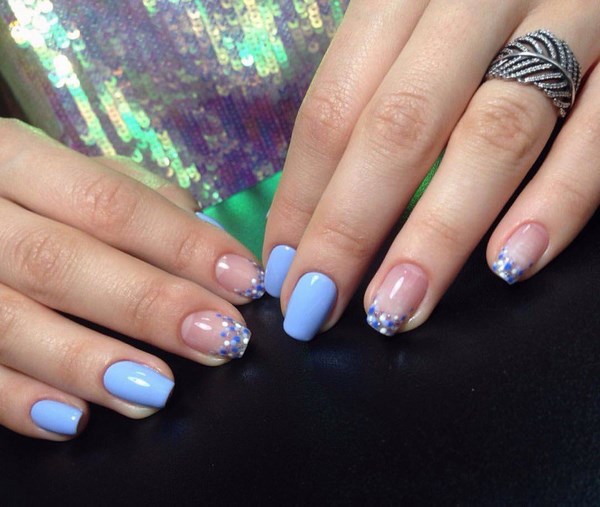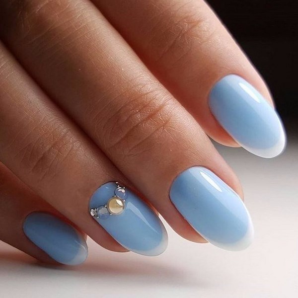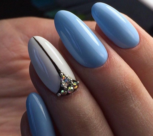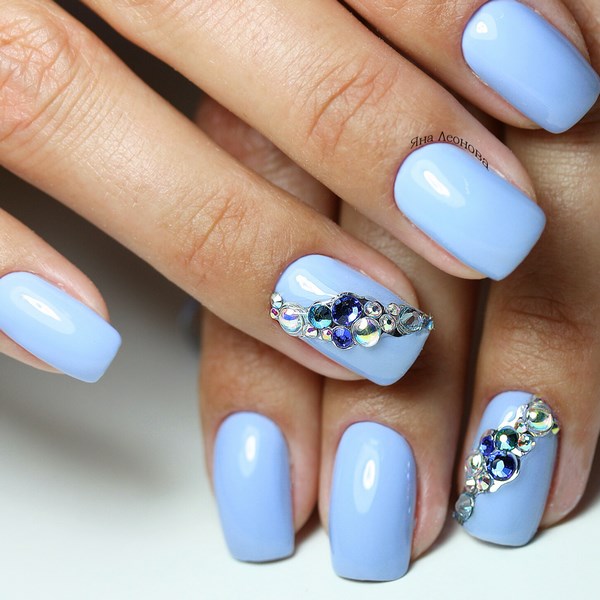 Vous pouvez créer une emphase sur des doigts individuels avec l'aide de strass transparents, créant ainsi un beau motif.Vous pouvez également utiliser des strass colorés pour la manucure bleue pour les assortir à la robe, qui est également élégante.