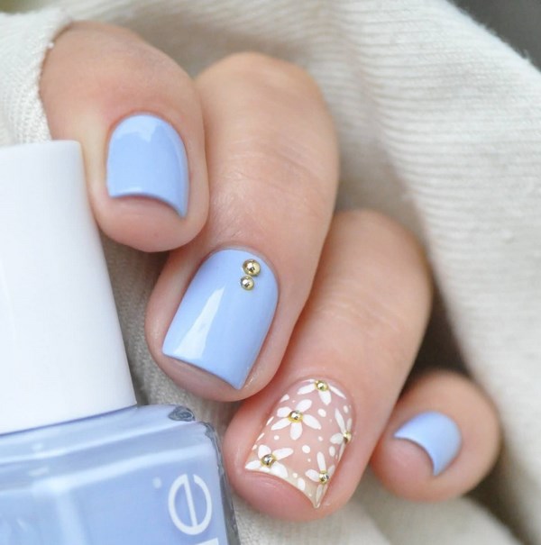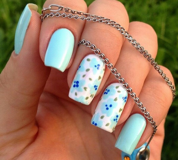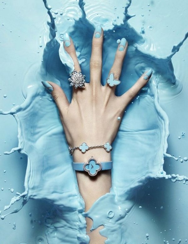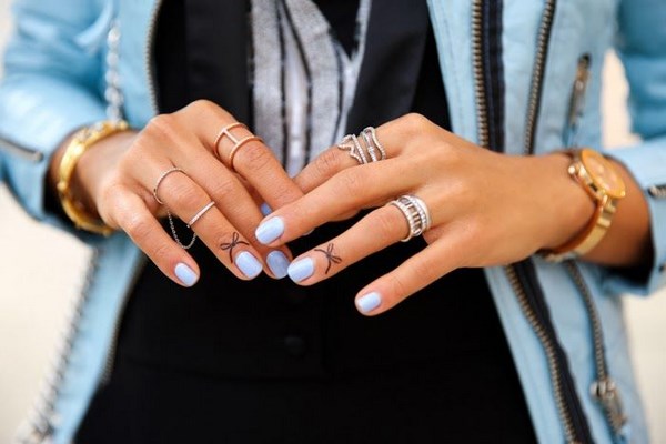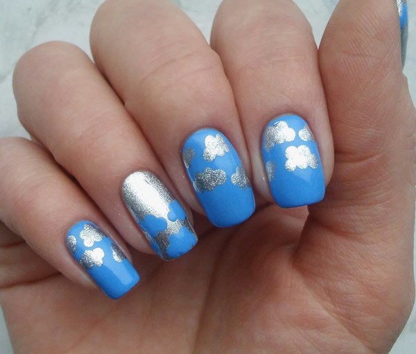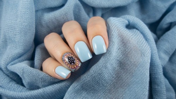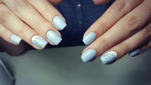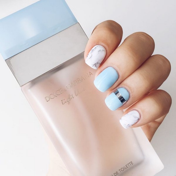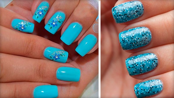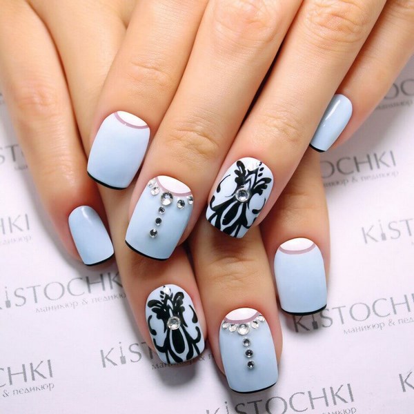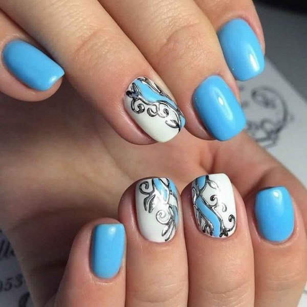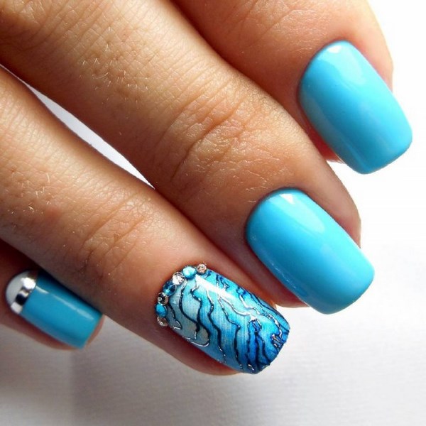 La belle manucure bleue est facilement complétée par différentes nuances de couleurs, mais il est préférable de la compléter avec un vernis et une décoration en blanc, argent, or, noir, qui sont des plus harmonieuses.