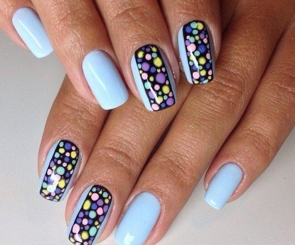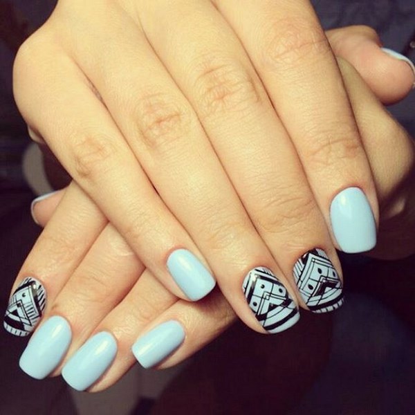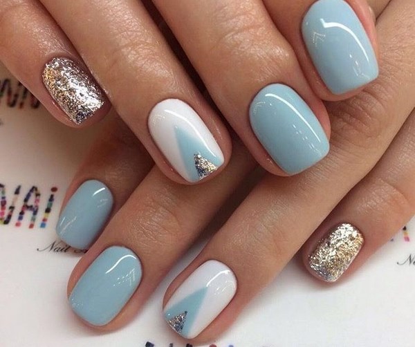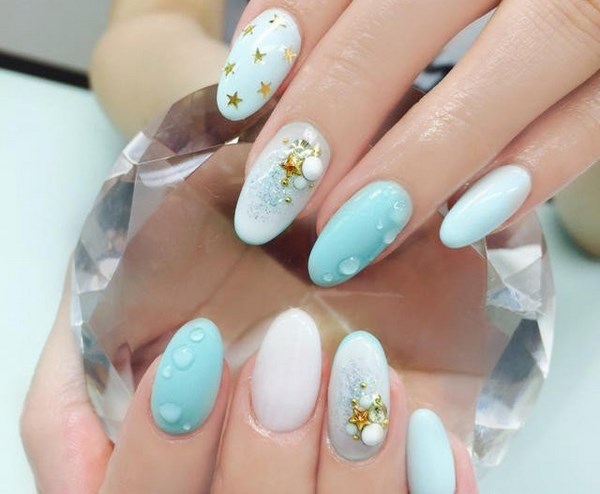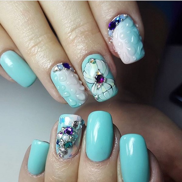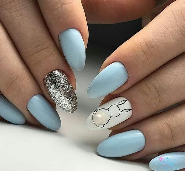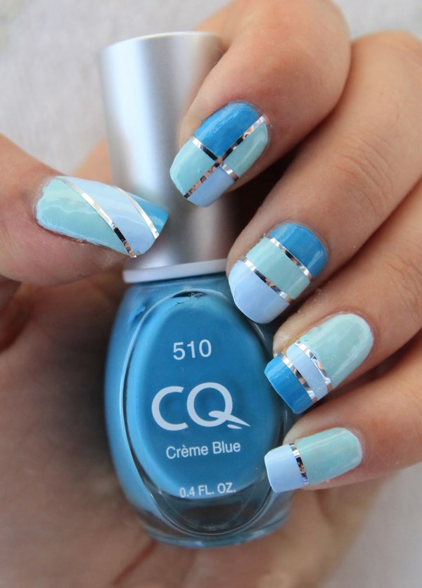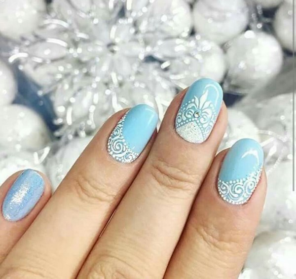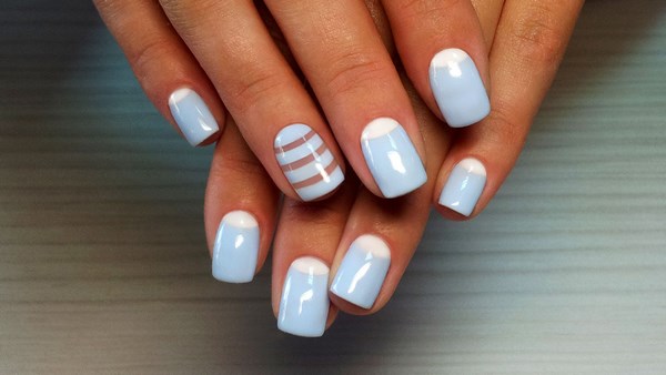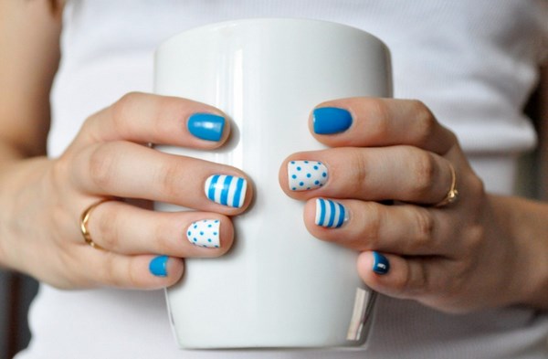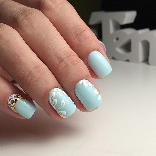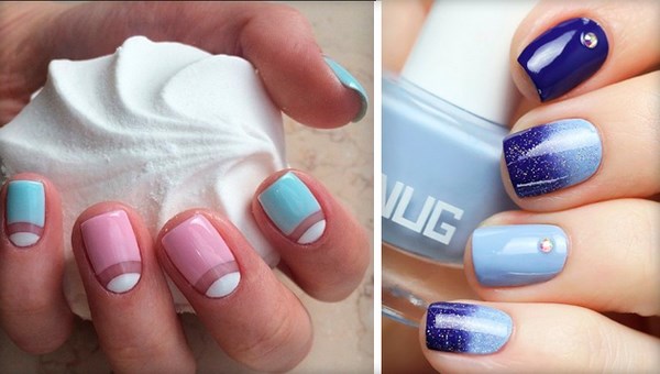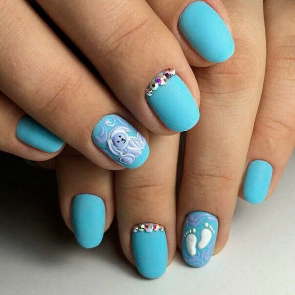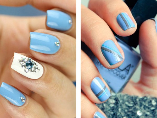 La conception de la manucure avec du vernis bleu est très originale et dépend tout d’abord de la période de l’année où vous allez porter une manucure bleue. Il peut s'agir de rayures, de pois, d'estampes et d'autocollants, ainsi que de motifs complexes, complétés par des strass et du modelage sur des ongles bleus.