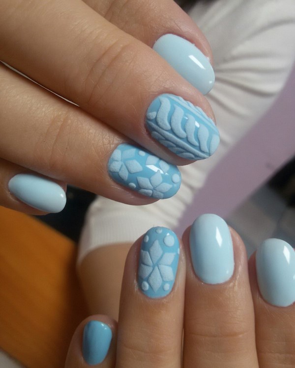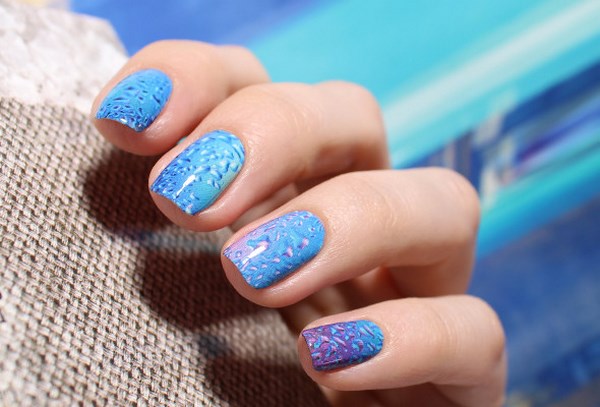 Une excellente manucure bleue peut être réalisée à l'aide de la technique de sculpture, mais également par frottement, ce qui permet de simuler différentes surfaces des ongles - verre, métal, tissu.