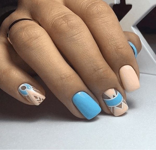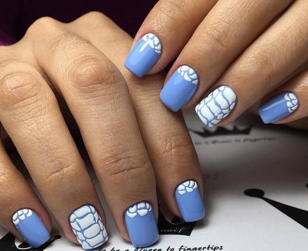 La manucure bleue imprimée dans un style géométrique - des rayures, des pois, des lignes de différentes épaisseurs a l’air élégant. Une manucure bleue romantique vous aidera à créer des boucles, de la dentelle, de jolies fleurs et des brindilles délicates.