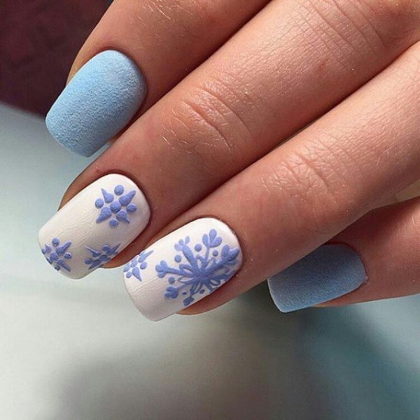 En ce qui concerne les dessins thématiques sur les ongles, sur le vernis bleu, les dessins d'hiver ont fière allure: flocons de neige, motifs givrés, bonhommes de neige, ours en peluche, arbres de Noël.