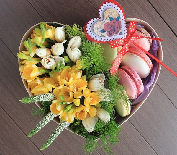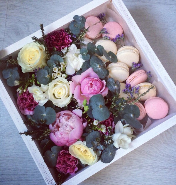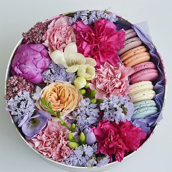 Par conséquent, si vous ne savez pas ce qui peut être présenté comme cadeau, procurez-vous un bouquet de fleurs dans une boîte, complétée par de délicieux macarons magiques, et votre meilleur cadeau sera prêt.