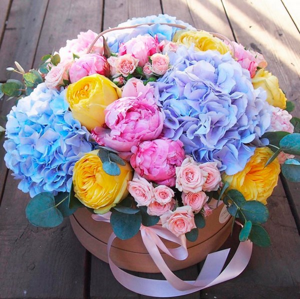 Les meilleurs bouquets de fleurs dans une boîte à chapeau peuvent être très variés: pivoines sophistiquées, hortensias insolites, roses classiques, orchidées exquises et belles tulipes.