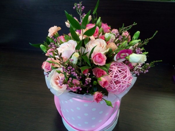 La tendance la plus commune, sans exagération, est les meilleurs bouquets de fleurs dans une boîte à chapeau. Cette conception de fleurs est très inhabituelle et extraordinaire, mais cette tendance a réussi à gagner les cœurs de nombreux représentants du beau sexe.
