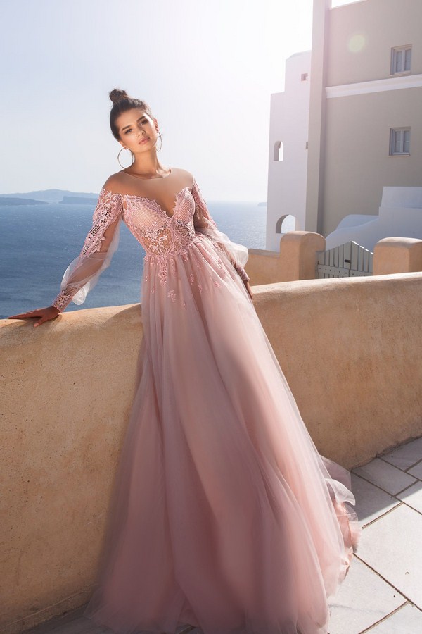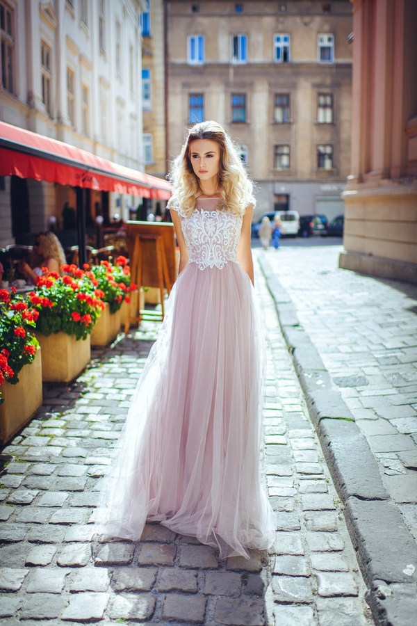 Des robes de soirée superposées aux couleurs apaisantes - lilas, rose, pêche, rendant l’image douce, sophistiquée et douce.