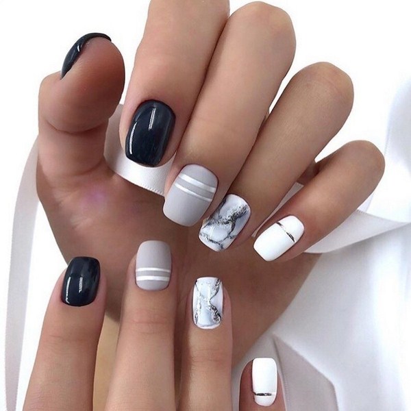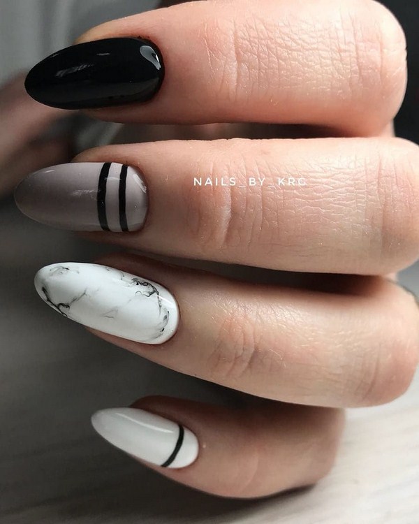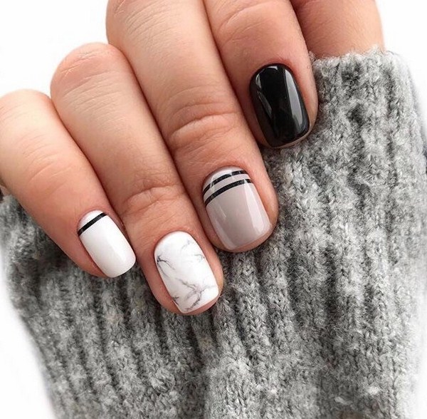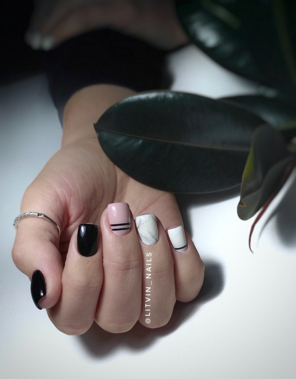 Une manucure de lune sans prétention peut être complétée par une conception non moins sobre avec un motif en marbre, créant une merveilleuse emphase sur quelques doigts. Les nouveautés de marbre avec des trous dans la conception des ongles sont présentées en trois couleurs: noir, gris et blanc, ce qui vous permet d’expérimenter le style de la lunule, la forme des ongles ainsi que la longueur, en obtenant une magnifique manucure sur la lune.