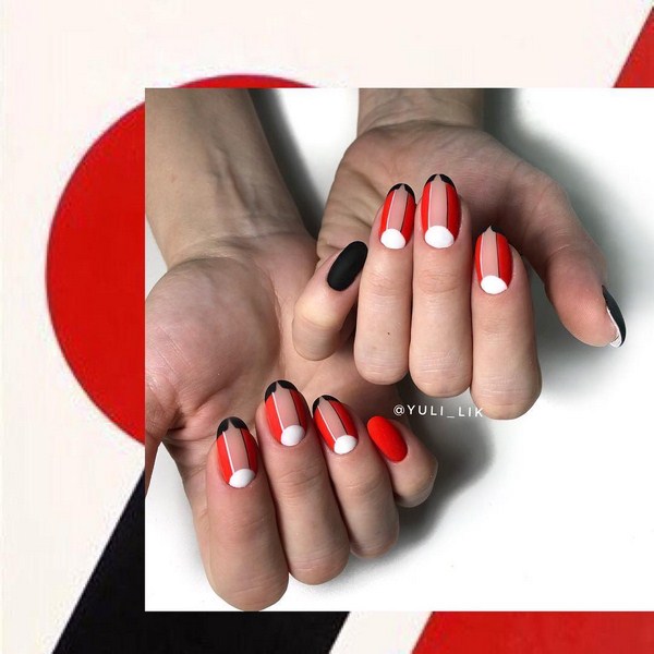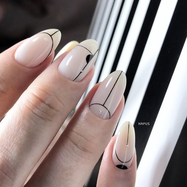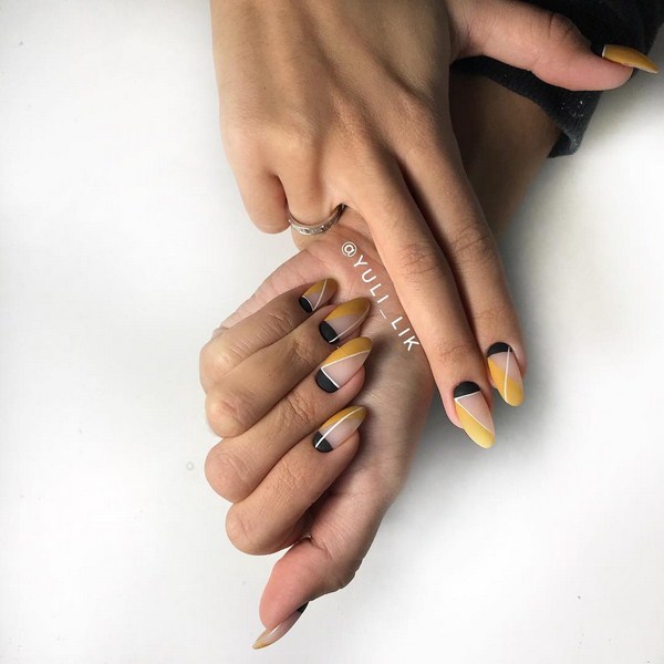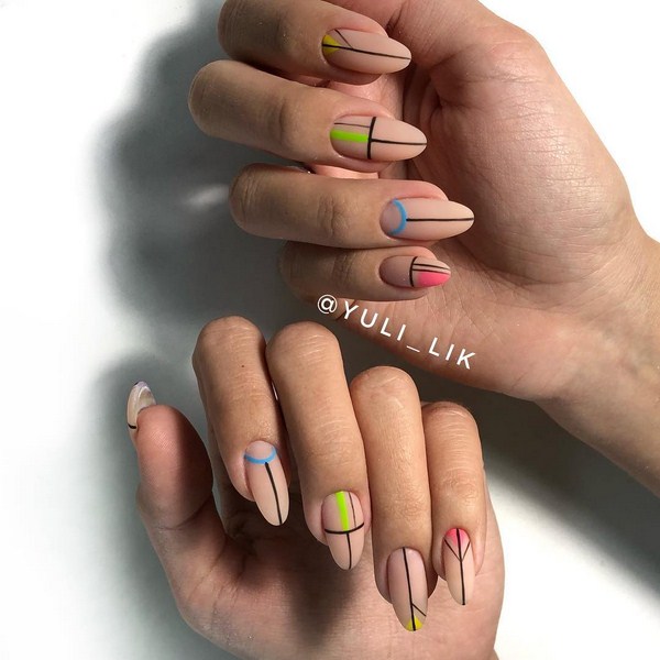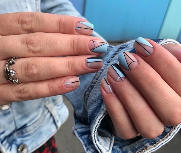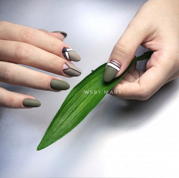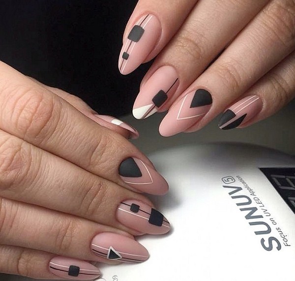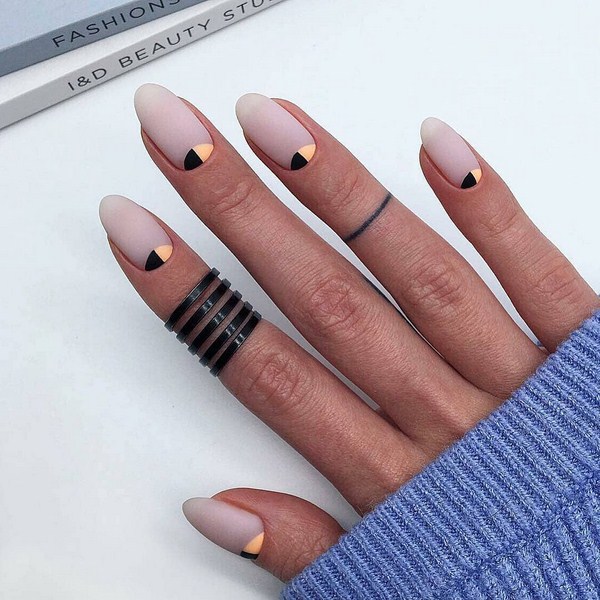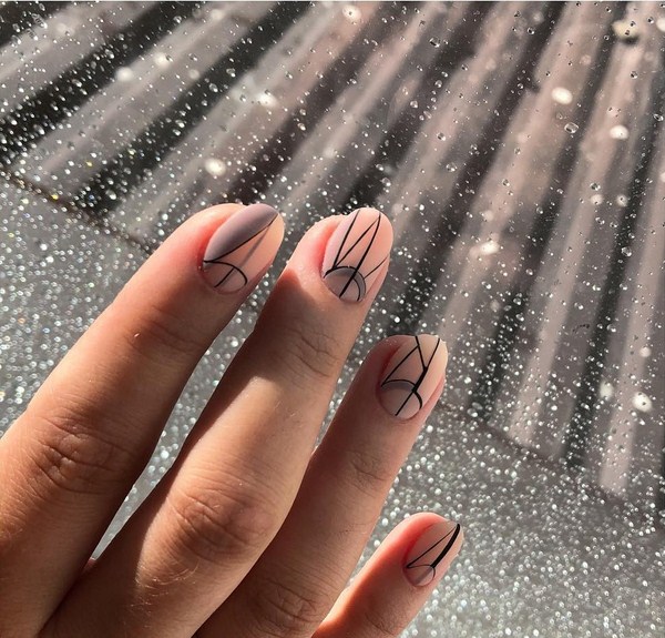 À la nouvelle saison, les maîtres proposent de ne pas s'arrêter à une manucure à la mode sur l'option des trous triangulaires, mais de compléter cette technique à la mode par des graphiques. La géométrie sera un ajout incroyablement à la mode à la conception de manucure lunaire, en particulier dans une finition mate.