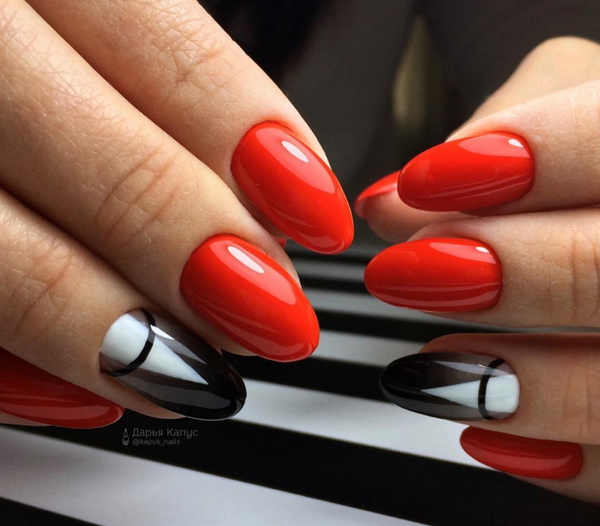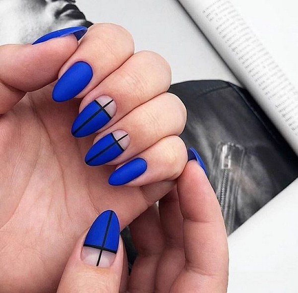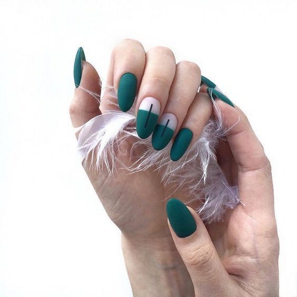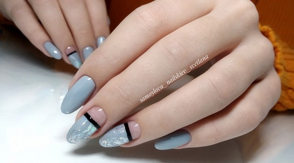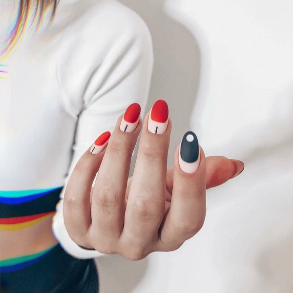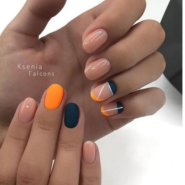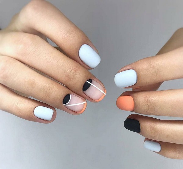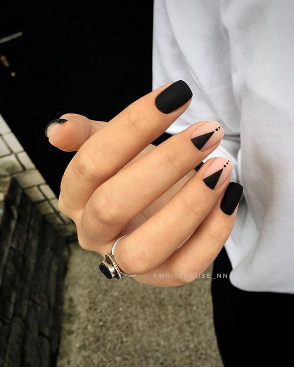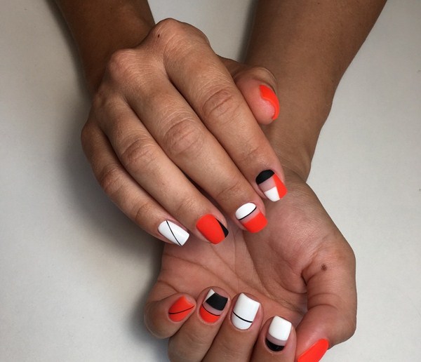 À la nouvelle saison, les maîtres proposent de ne pas s'arrêter à une manucure à la mode sur l'option des trous triangulaires, mais de compléter cette technique à la mode par des graphiques. La géométrie sera un ajout incroyablement à la mode à la conception de manucure lunaire, en particulier dans une finition mate.