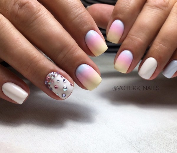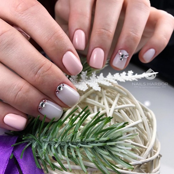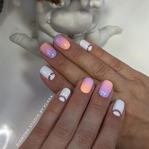 Il peut exister de nombreux modèles de manucure lunaire avec étirement des couleurs, en commençant par la combinaison traditionnelle de trous surlignés sur un couple de doigts avec manucure en ombre sur le reste, et en terminant par l’effet en ombre avec plusieurs nuances, qui imitent l’attribution d’une lunule en utilisant une certaine couleur. Pour les vrais admirateurs de ce beau maître, ils ont préparé une manucure lunaire combinée à un espace négatif, un dégradé et des perles, qui a l'air excitant.