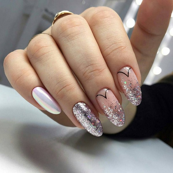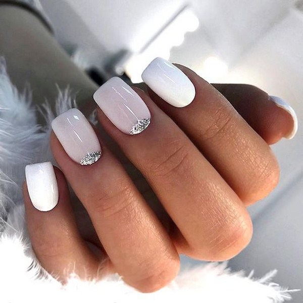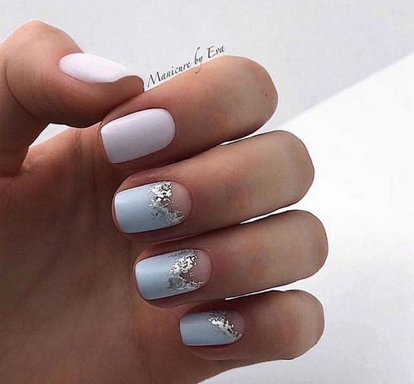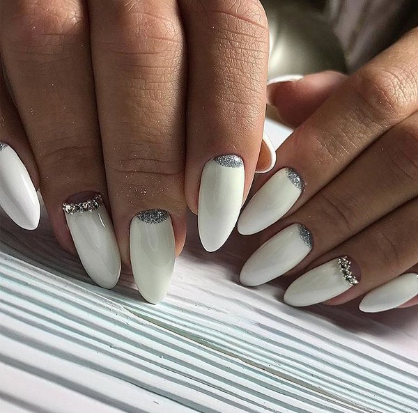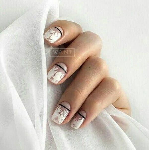Le design lunaire est magnifique dans une gamme de nuances claires, allant du blanc neige aux tons crème et nude. Un modèle lunaire similaire conviendrait à l’image des mariées, s’il était complété par des strass et des cailloux. Manucure légère irrésistible avec des trous et des étincelles de feuille, des confettis, des paillettes, ainsi que des impressions géométriques.