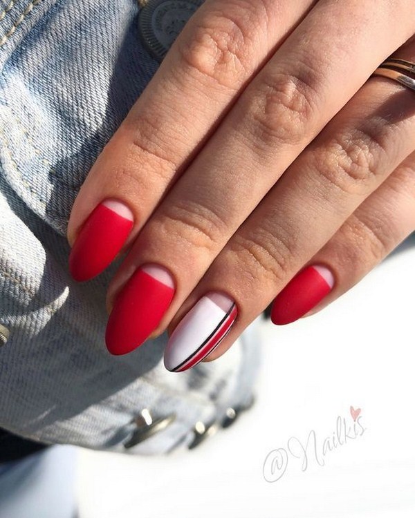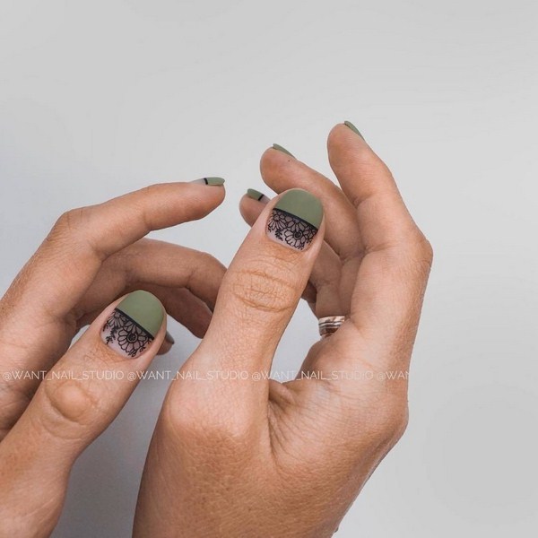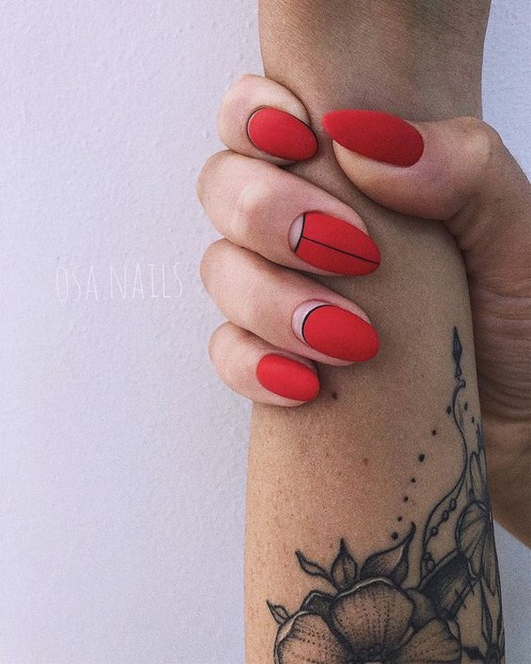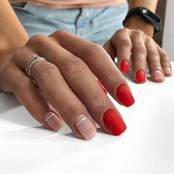 La tendance dans la conception de manucure continue à être l'effet de la matité sur les ongles, qui est si belle avec un design de lune. Un rouge passionné, un noir laconique, un bleu étonnant, un gris calme seront parfaits dans une conception mate de manucure avec des trous.Les dessins dans une manucure lunaire mate, une manucure lunaire "envahie par la végétation", un "espace négatif" et une veste trouée dans une solution mate sont les bienvenus.