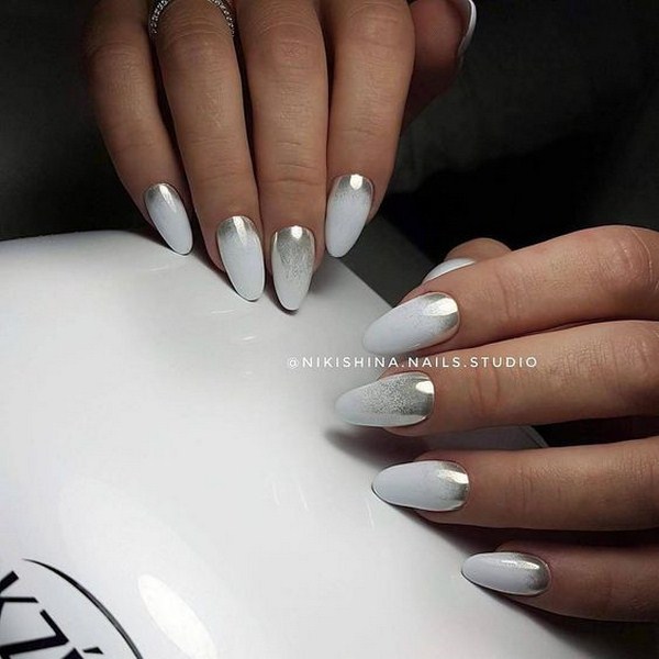 Une apparition intéressante et vraiment solennelle de la manucure lunaire 2025-2026 est offerte avec un frottement. La brillance de la friction vous permettra de mettre en évidence les trous et de donner du glamour à la manucure de la lune. Nous vous suggérons de choisir un frottement en miroir avec une teinte argentée et une manucure monochrome blanche pour réaliser un dessin d’ongles ultra-tendance avec des trous.