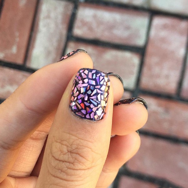 Des autocollants holographiques, une cellophane à effet miroir et une feuille de différentes nuances sont utilisés pour appliquer l'effet «verre brisé» sur les ongles.