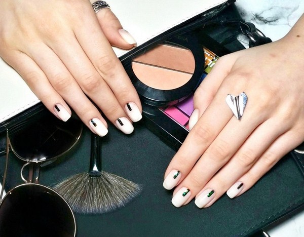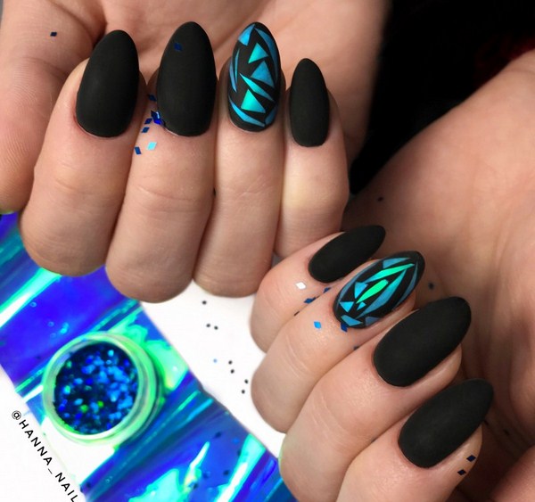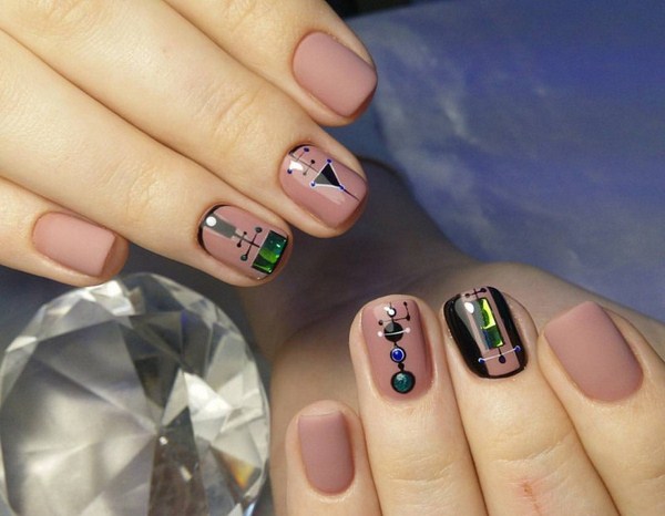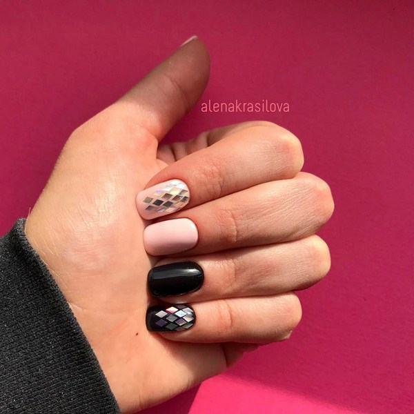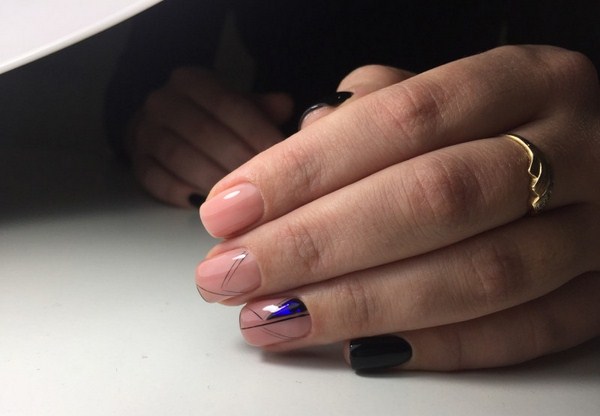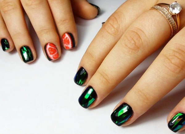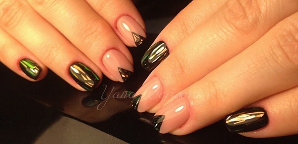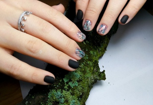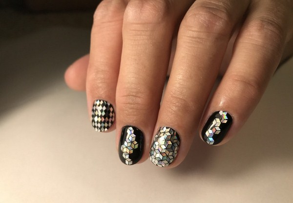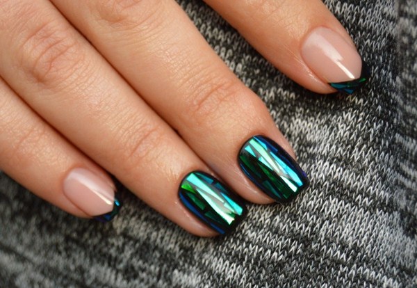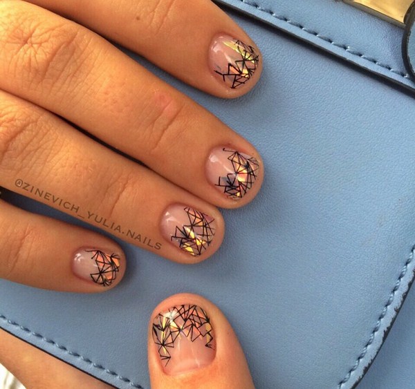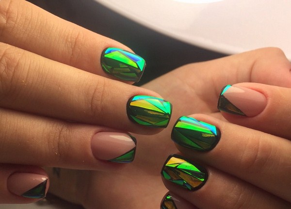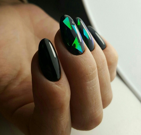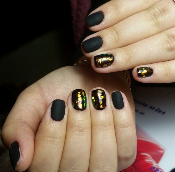 L'un des plus spectaculaires peut être appelé manucure noire "verre brisé". Grâce au revêtement sombre, les morceaux de film semblent plus brillants, en particulier les tons doré et argenté de la manucure en verre brisé.