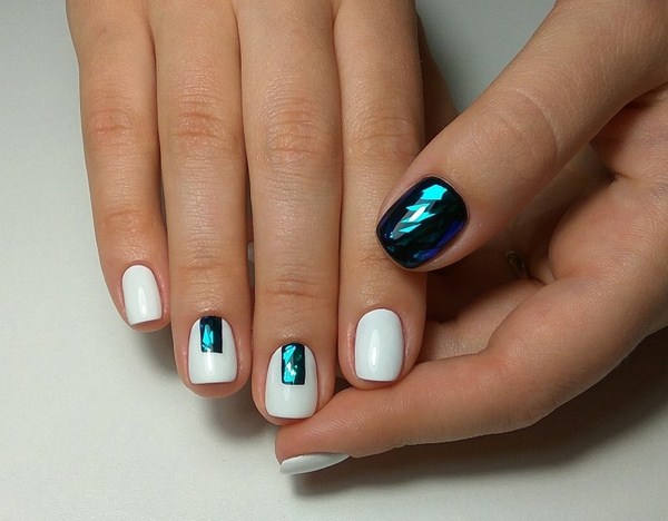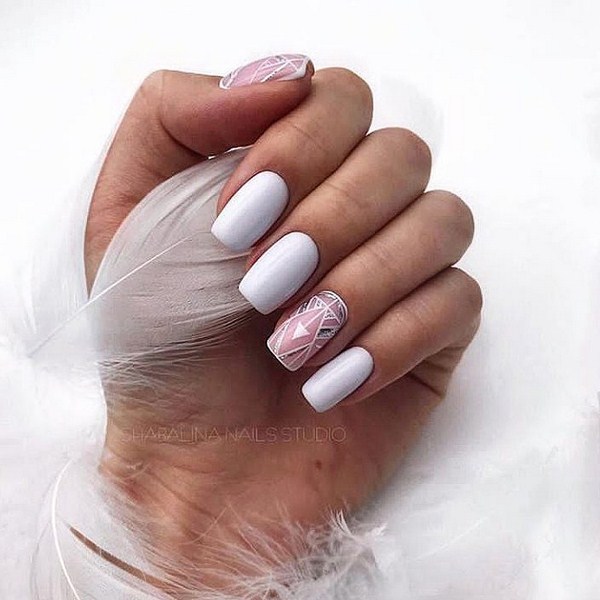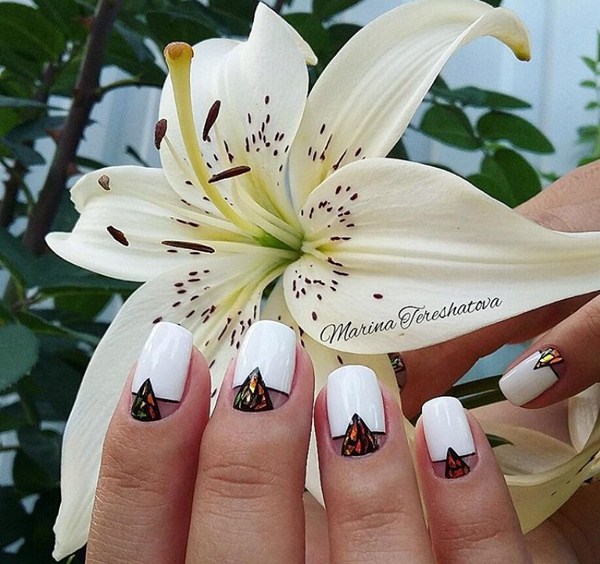 La manucure tendance en verre brisé peut également être réalisée en blanc avec des couleurs de feuille contrastantes. Les ongles avec «verre brisé» et un revêtement translucide ou des ongles solides auront l’air doux.