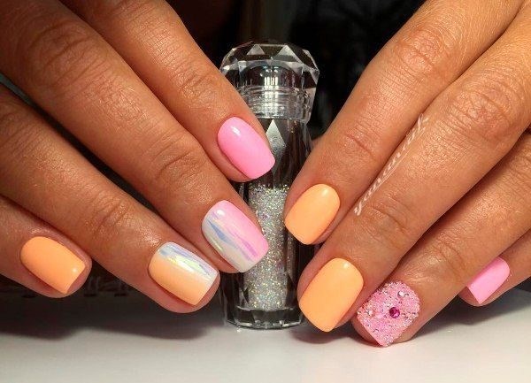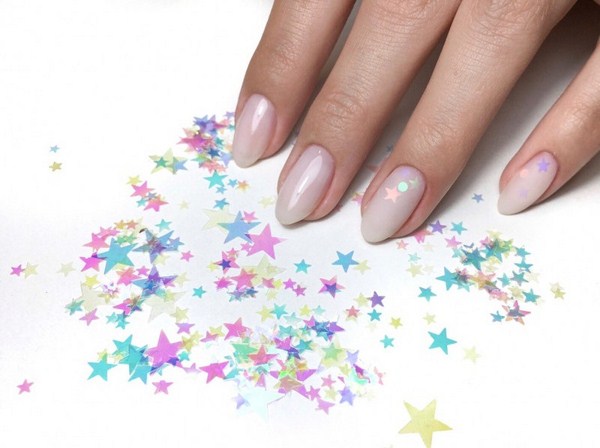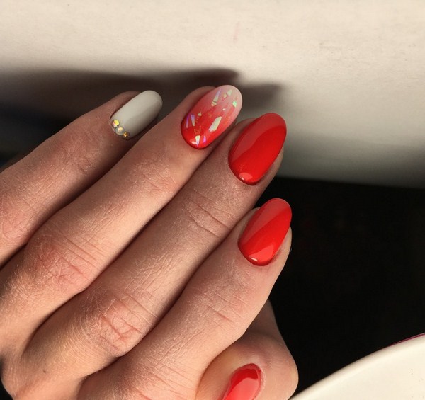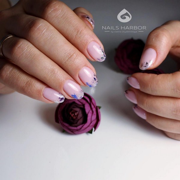 Une manucure avec du verre brisé et des transitions de couleurs dégradées est magnifique. Choisissez quelques teintes préférées dans une couleur délicate ou saturée et créez un dégradé intéressant d'un doigt à l'autre. Décorer une paire de soucis ombre avec des éclats de papier d'aluminium. Un design similaire des ongles 2025-2026 aura l'air mignon, donnant l'élégance aux poignées.