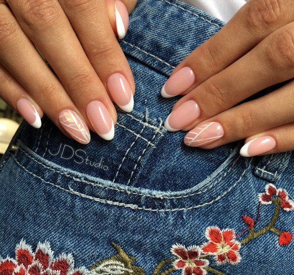 Une belle manucure «verre brisé» peut être combinée au mieux avec le design français, qui se complètent parfaitement. Il est possible de disposer des "fragments" de différentes manières: sous la forme d'un "sourire", un ongle est accentué sur toute la surface du doigt. Chacune des options pour «verre brisé» avec une veste aura l’air intéressant et certainement pas ennuyeux. Les plus spectaculaires seront des fragments sombres, mais la veste blanche peut être décorée avec des nuances délicates de papier d'aluminium sur l'un des doigts.