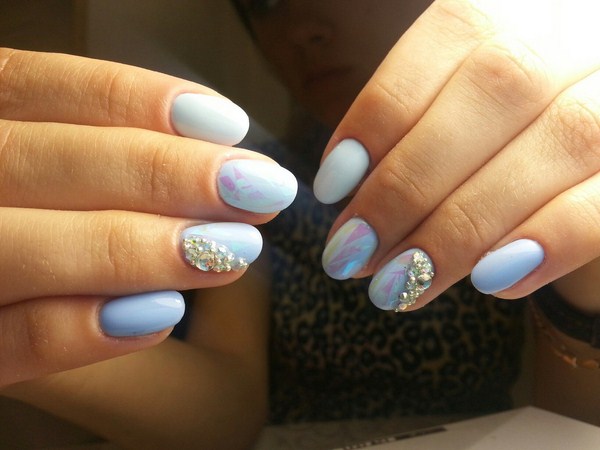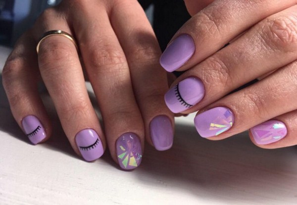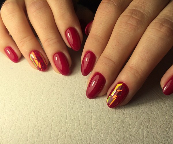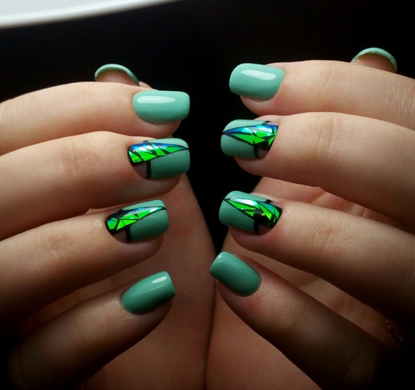 Vous pouvez choisir une belle manucure en verre brisé pour une soirée avec un revêtement sombre, sur lequel des morceaux de papier d'aluminium seront plus expressifs et spectaculaires. Pour la conception «en verre brisé» pendant la journée, les couleurs pastel seront préférables.