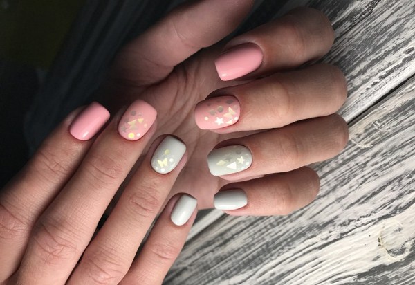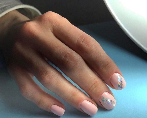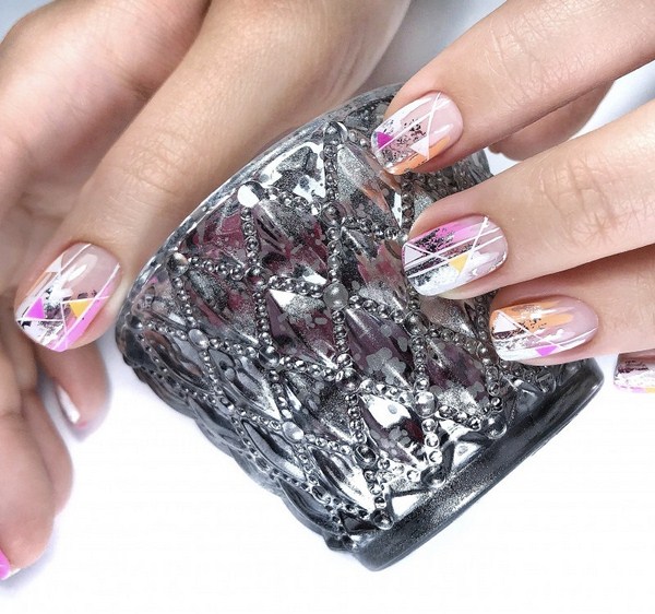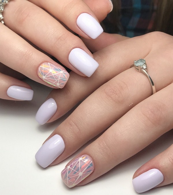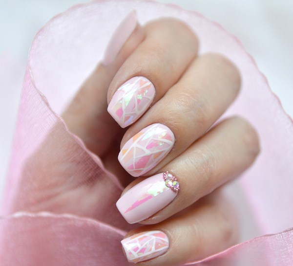 Si vous voulez une manucure à la mode très sophistiquée «verre brisé» 2025-2026, alors il vaut mieux regarder de beaux losanges, cœurs, cercles, étoiles, étoiles, triangles aux couleurs pastel douces.