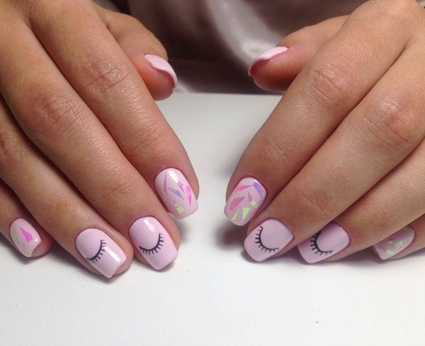 Le design tendance en verre brisé a fière allure et est autonome sans décor. Mais vous pouvez toujours essayer des imprimés mignons ou merveilleux, si vous en avez envie. Mais les impressions doivent être concises et simples, pour que les "fragments" ne perdent pas tout leur charme dans le nail art à la mode. Une idée intéressante pourrait être de dessiner des cils sur les doigts adjacents à du verre brisé. Une manucure en verre brisé simple et élégante 2025-2026 avec dessins ajoutera une touche de légèreté à votre look.