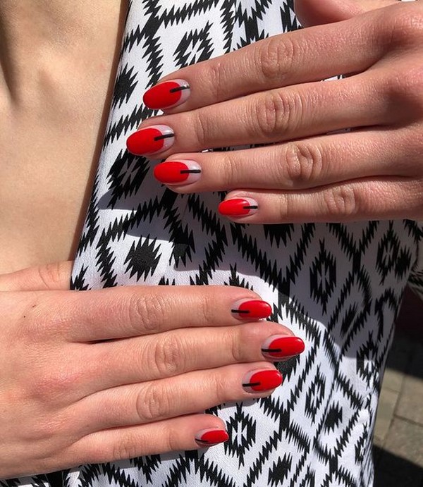 Le minimalisme à la mode des manucures peut être réalisé avec des slops non seulement dans des tons naturels, mais aussi avec du rouge. Avec une telle touche, la conception du minimalisme de manucure deviendra plus solennelle, ce qui conviendra, par exemple, pour compléter l'image sur la soirée corporative.