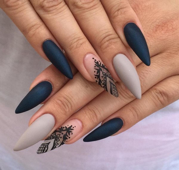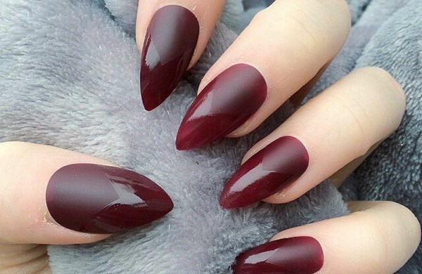 Manucure mate élégante pour les ongles acérés 2025-2026 avec des teintes sombres de vernis - noir, bordeaux, vin, marsala, bleu, vert. Pour plus d'originalité, vous pouvez combiner une manucure mate sur des ongles acérés avec une ongle brillante, ou vous pouvez mettre en surbrillance une paire d'ongles avec un frottement ou une feuille, ce qui donnera également originalité et nouveauté.