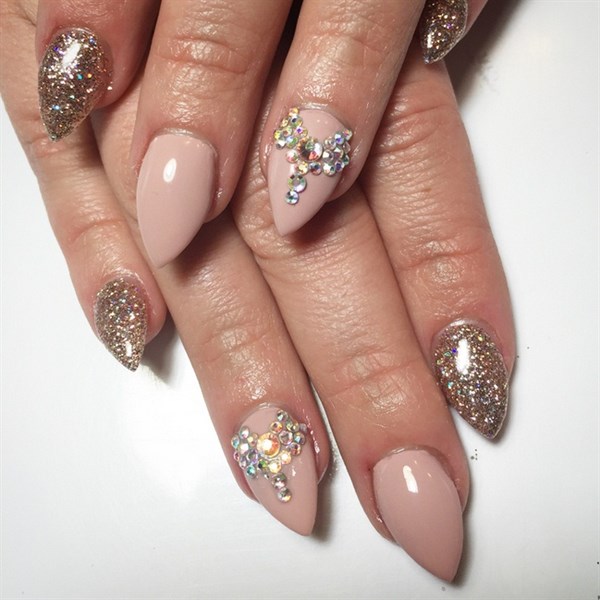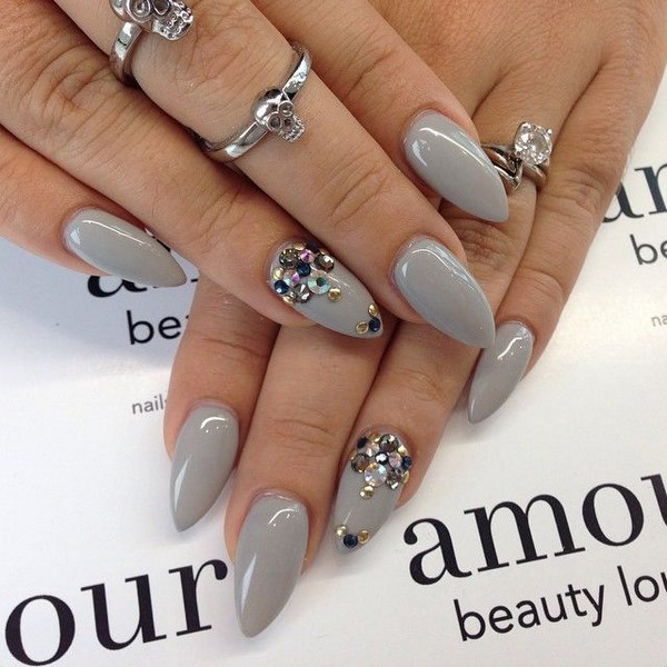 Une manucure de soirée est particulièrement belle si vous la réalisez sur des ongles acérés dans une teinte tendance de gel, tout en décorant de strass l’ongle entier, une partie de celui-ci ou même l’utilisation de plusieurs cailloux.