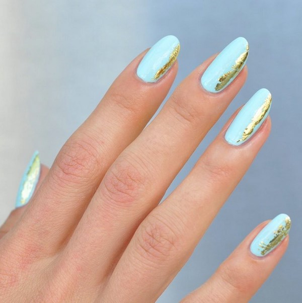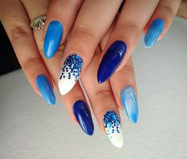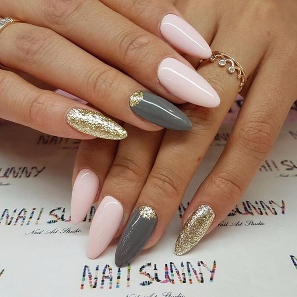 N'ayez pas peur d'expérimenter et d'essayer un vernis gel brillant sur les ongles pointus, par exemple vert, turquoise, rose, fuchsia, bleu, violet, en effectuant une manucure à espace négatif ou bloc de couleurs d'apparence brillante et élégante.