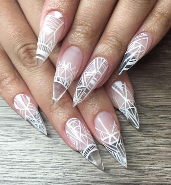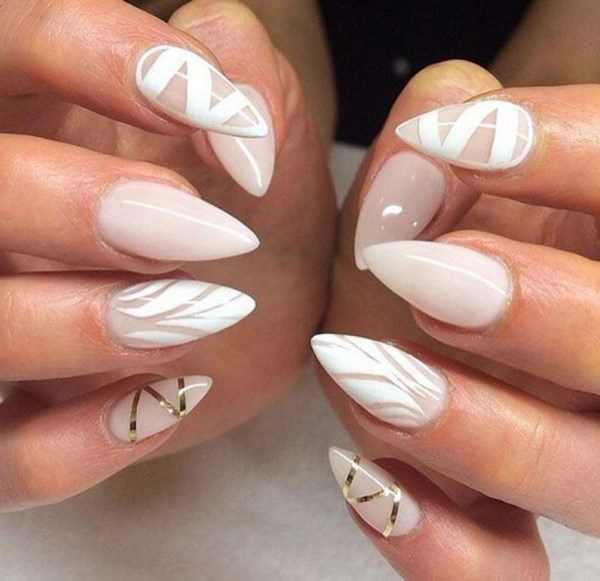 Vous pouvez obtenir une manucure concise et à la mode pour les ongles acérés si vous utilisez un polish gel beige ou blanc en combinaison avec du noir, en les utilisant pour dessiner des dessins dans un style géométrique et divers motifs ajourés, dont vous trouverez des exemples dans notre sélection de photos.