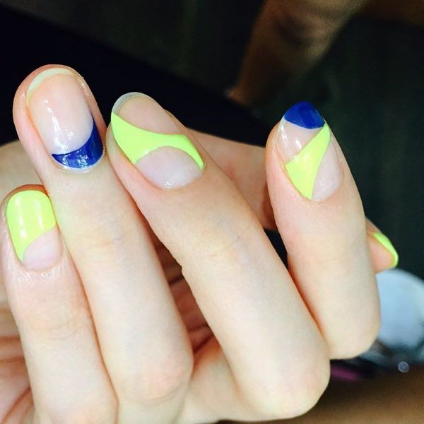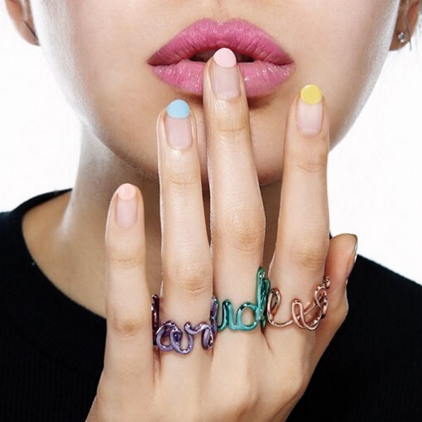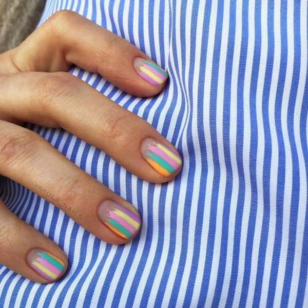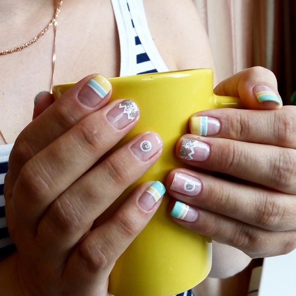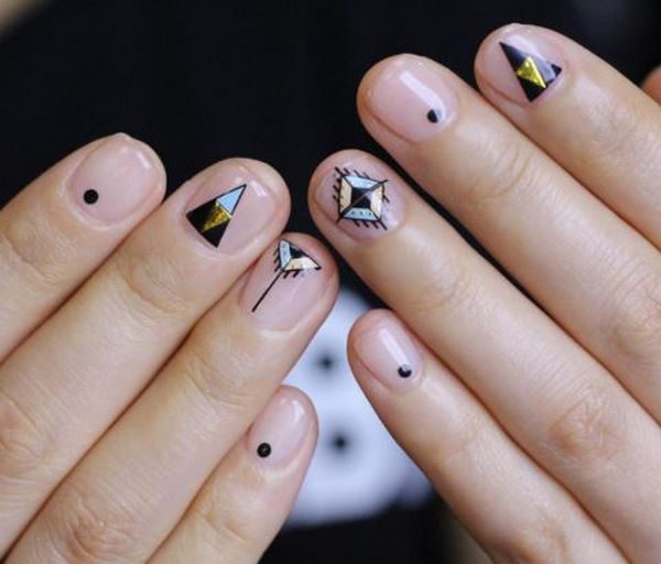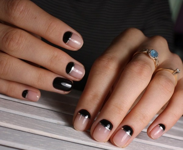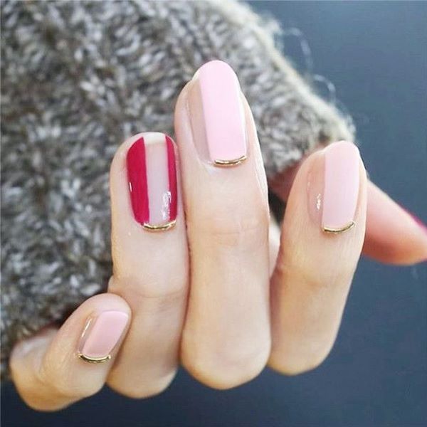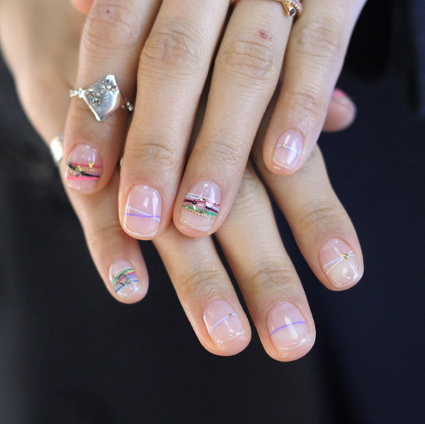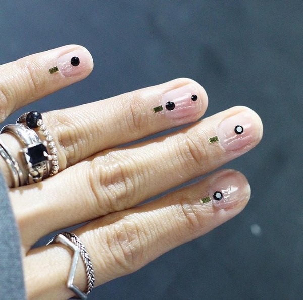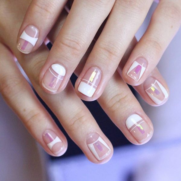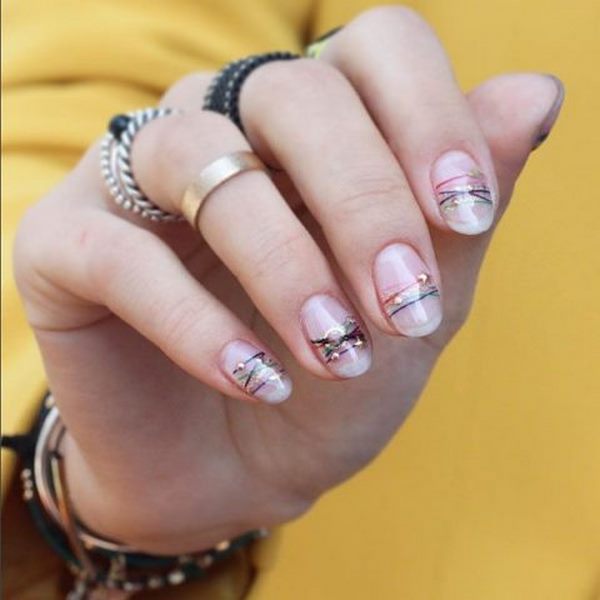 Ajoutez de l'espace libre dans la manucure de l'espace négatif avec des points sur chaque doigt, des rayures, des morceaux de papier d'aluminium, des touches de gel brillant coloré, et la manucure de style "nu" de style minimalisme est prête.