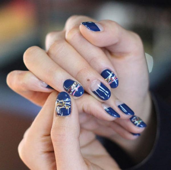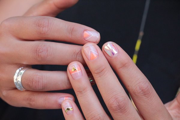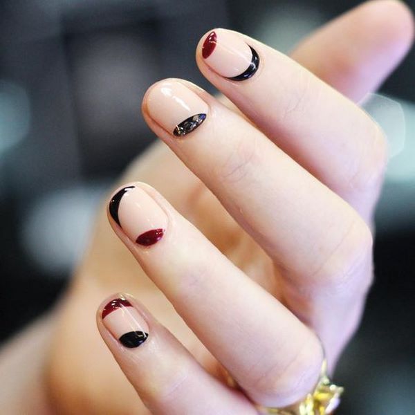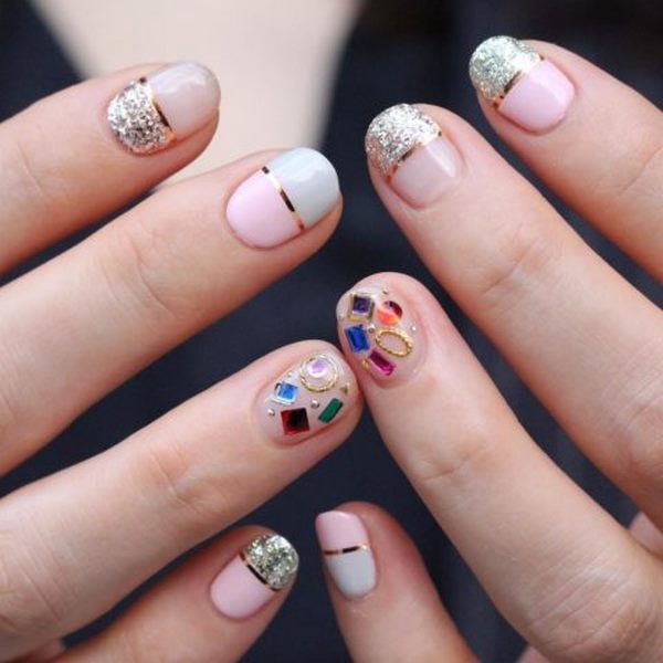 En option, chacun des doigts d'une manucure nue peut être composé de dessins et de gravures différents, l'un d'entre eux pouvant n'être que du verre brisé. Pour rendre le design intriguant, appliquez des vernis brillants et un décor, comme dans nos exemples de photos.