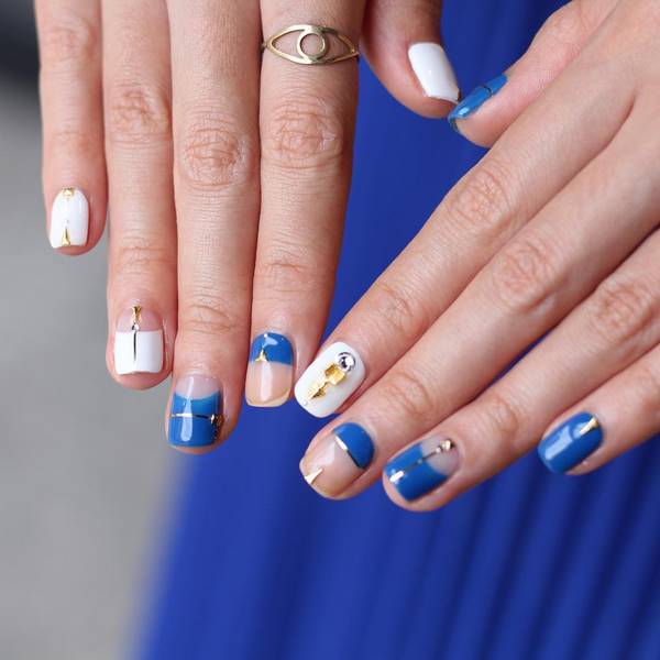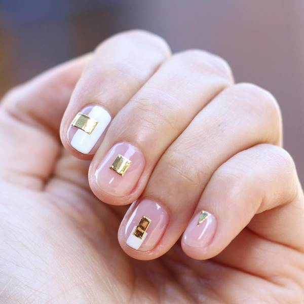 Des fils d'or et de petits strass, des perles et des cailloux vous permettront de réaliser un superbe design pour espace négatif, qui est particulièrement joli sur des ongles courts.