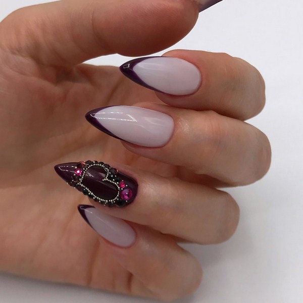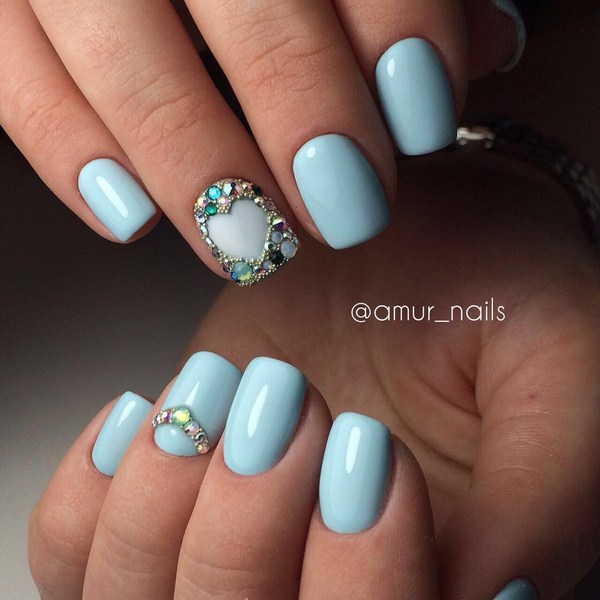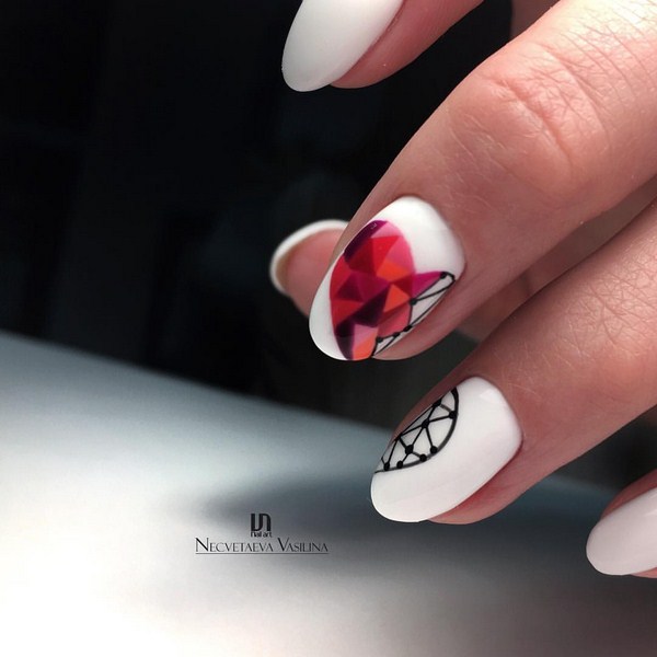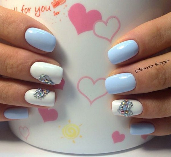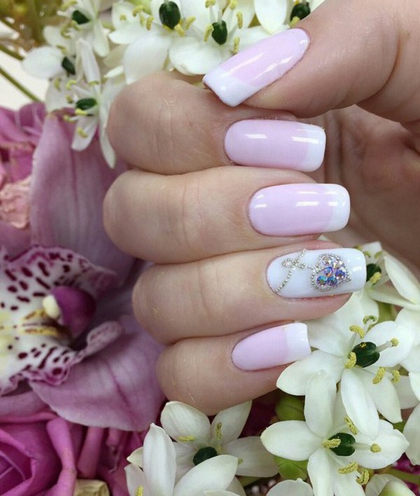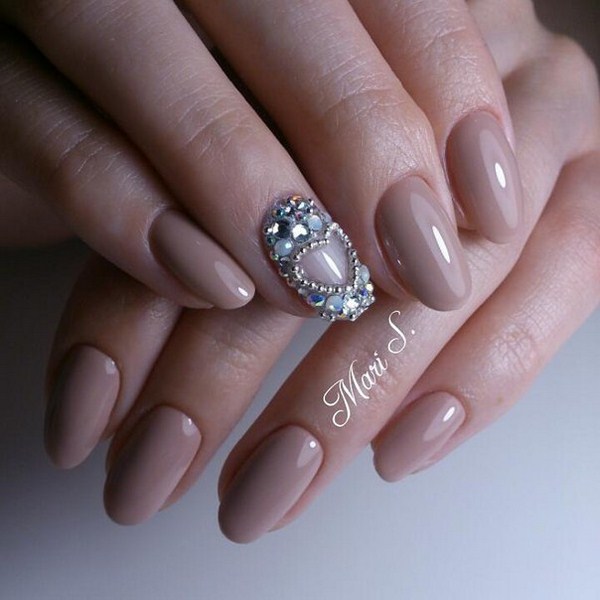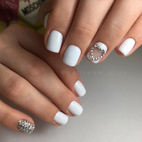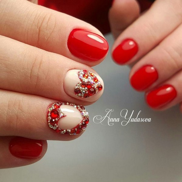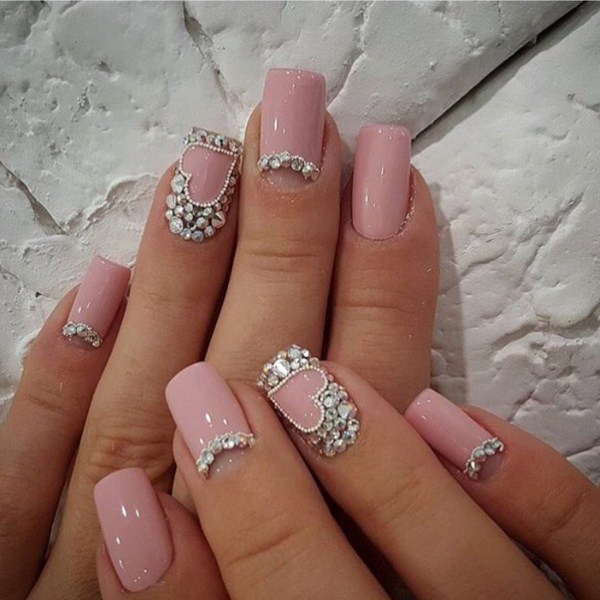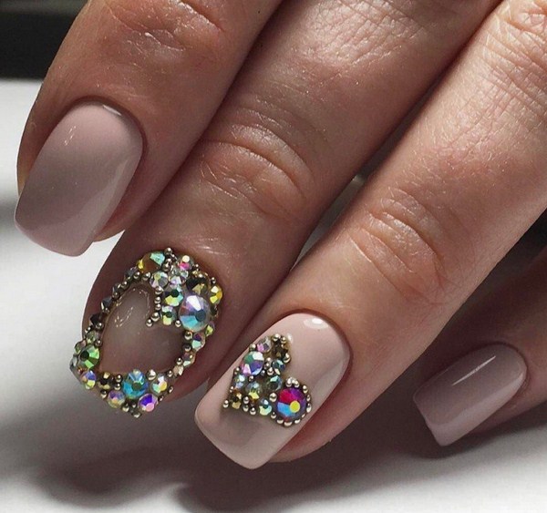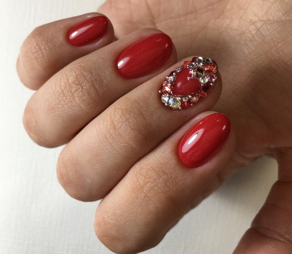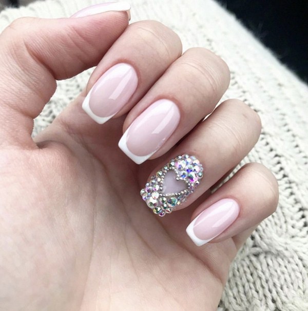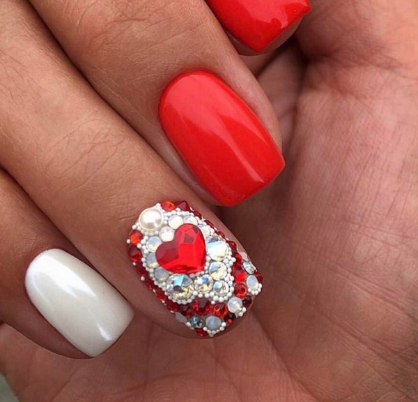 La manucure actuelle du 14 février est charmante strass design des ongles, permettant à la fois de compléter le nail art romantique et de recouvrir tout le doigt de cailloux avec un cœur, créant ainsi un accent sur la manucure à la mode le 14 février.