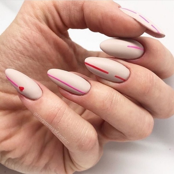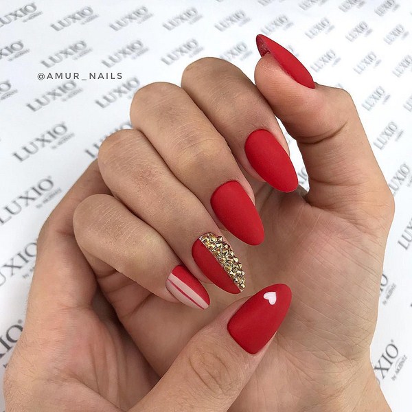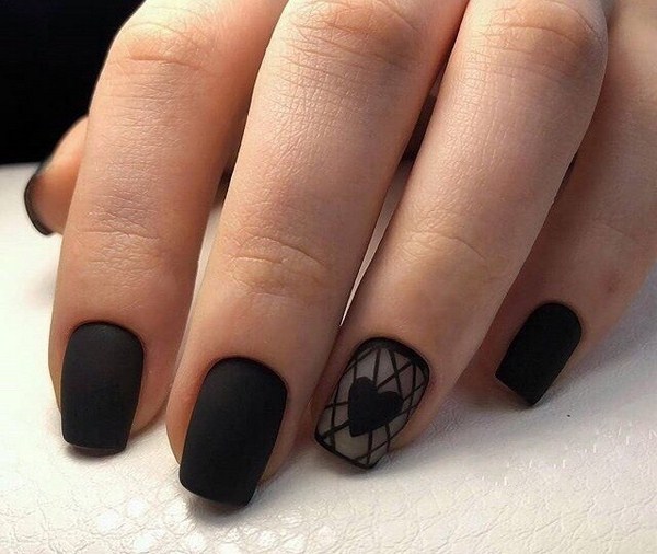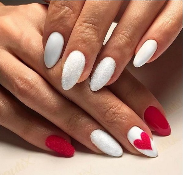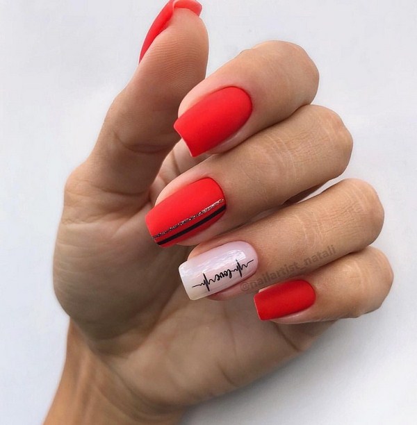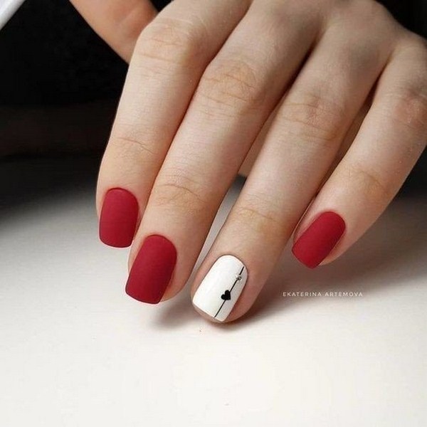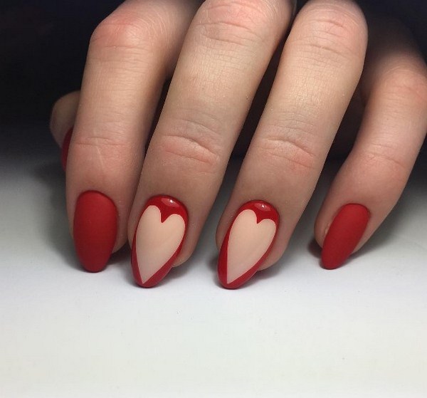 Effet délicat et profond sur les ongles dans votre couleur préférée que vous obtenez avec une finition mate sur les ongles. La matte à la mode est admirable et vous fait certainement prêter attention aux ongles en velours à la mode. Et si vous choisissez le rouge vif, les dessins de cœur, l’inscription «Amour» et un autre décor, vous recevrez alors une délicieuse manucure avec cœur dans une solution mate pour les vacances de tous les amoureux.