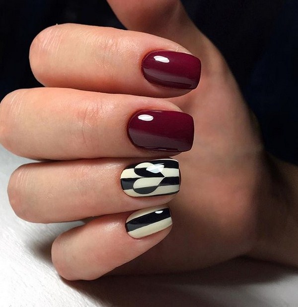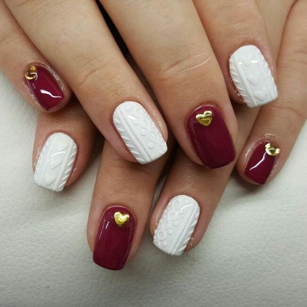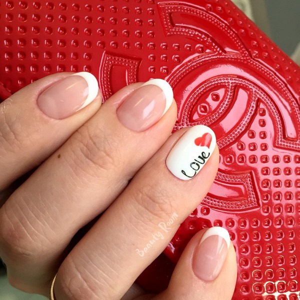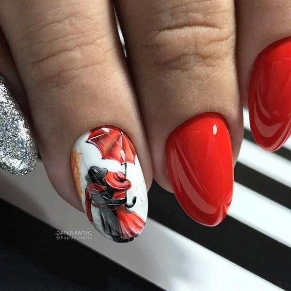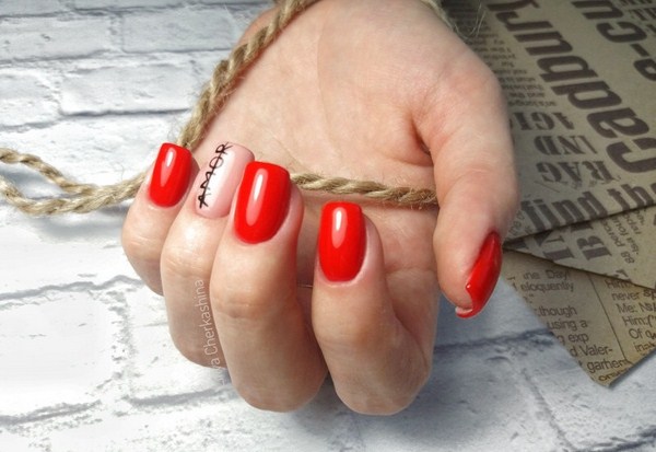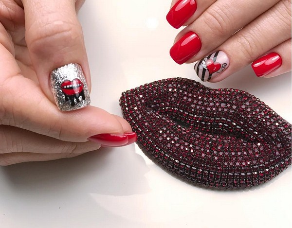 Il est difficile d'imaginer une véritable manucure solennelle sans une teinte rouge de vernis. Donner solennité et élégance à tout dessin d’ongle, une manucure rouge à la mode avec des cœurs, des mots, des images de couples amoureux deviendra une option gagnant-gagnant pour un ongle romantique à la mode pour le 14 février.