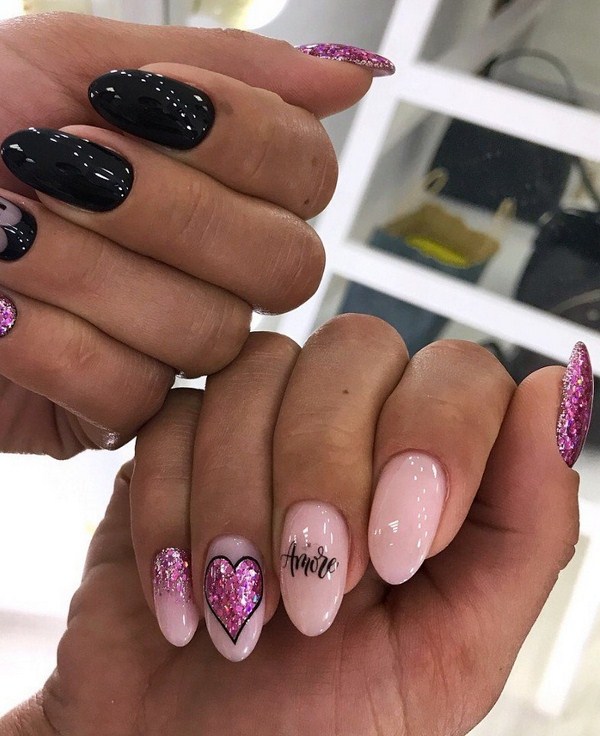 La douce brillance irradiant avec les ongles peut être obtenue grâce au frottement des perles, qui est tellement incroyable et luxueux dans la conception des ongles pour la Saint-Valentin. Des ongles élégants avec une friction peuvent être parfaitement décorés avec des inscriptions et des étincelles, complétées par des images de coeurs.
