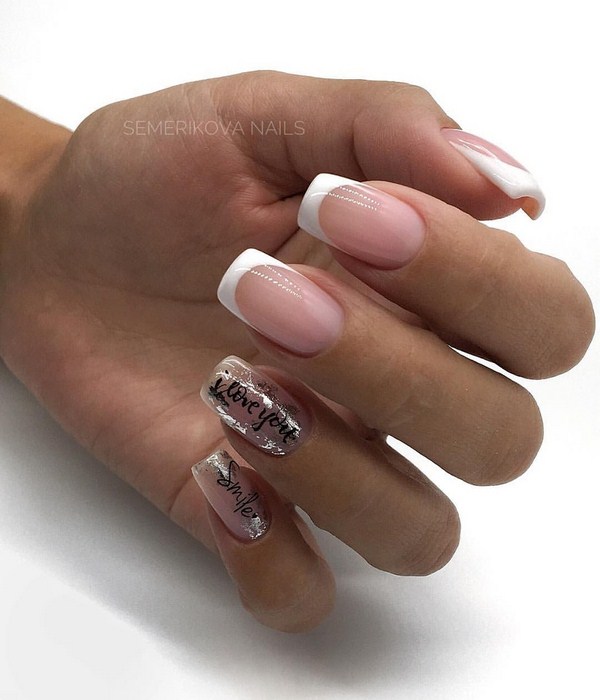 La désinvolture des «sourires» sur les ongles, quelle que soit leur couleur, permet même une manucure romantique le 14 février dans ce style. Français à la mode avec des coeurs pour le 14 février, vous pouvez faire du blanc et de la couleur - rouge, bordeaux, vin. La tendance romantique en manucure du 14 février est un doigt distingué avec des strass en forme de cœur, ainsi que les inscriptions «Je t'aime» avec des impressions argentées.