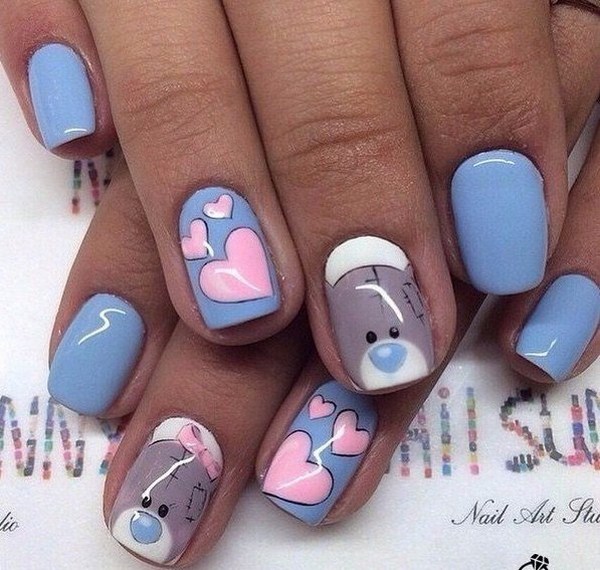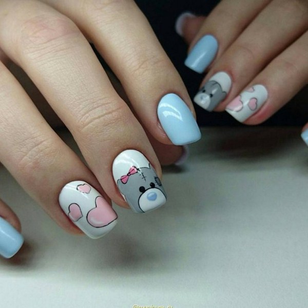 Des dessins d’ongles intrigants et amusants pour le 14 février seront ongles de mode avec l'image de lapins, ours en peluche, ainsi que des collations. Les ongles avec des inscriptions en forme de clou pour des vacances romantiques deviendront à la mode. On préférera des inscriptions avec des déclarations d'amour ou un "amour" concis.
