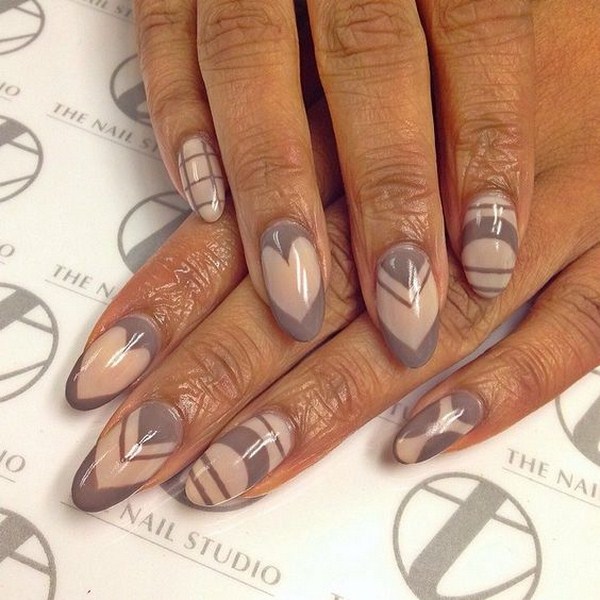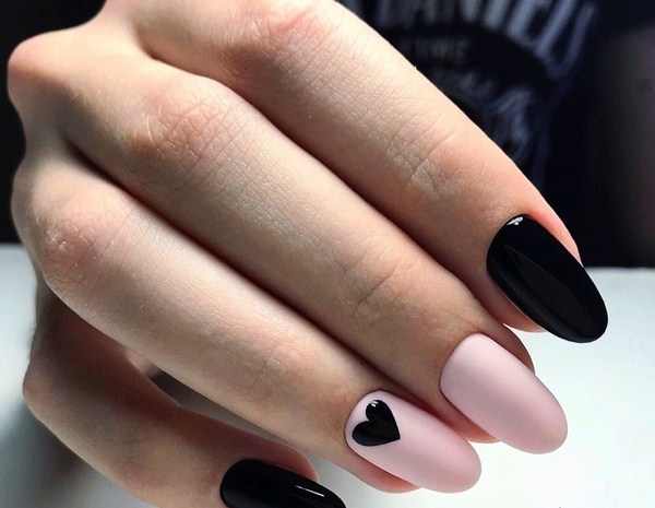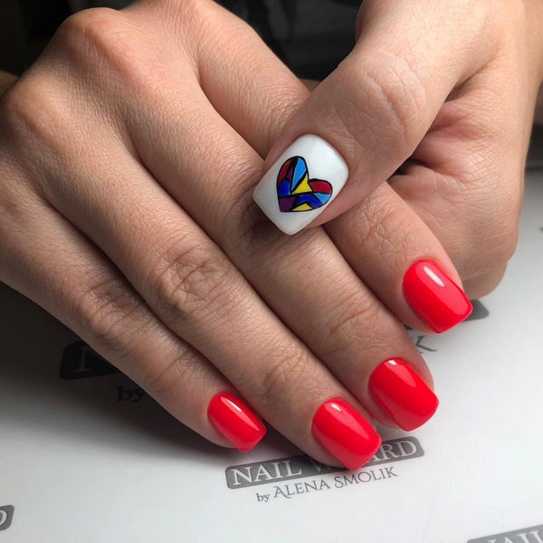 Un motif de cœur à la mode utilisant la technique du «color block» peut devenir différent des autres motifs d’ongles, à l’aide duquel l’image est divisée en plusieurs secteurs, recouverts de tons différents de la même couleur ou de vernis gel multicolore. La plupart du temps, le dessin du cœur est effectué sur le pouce lors de la conception de la manucure le 14 février.