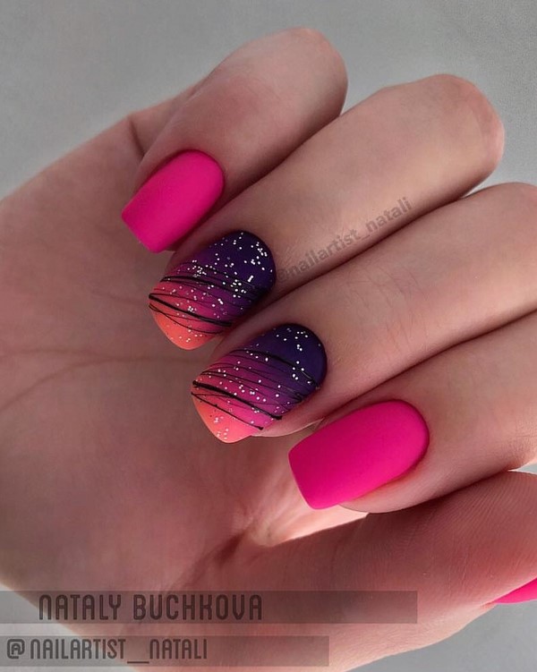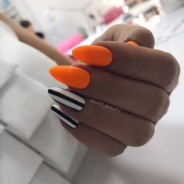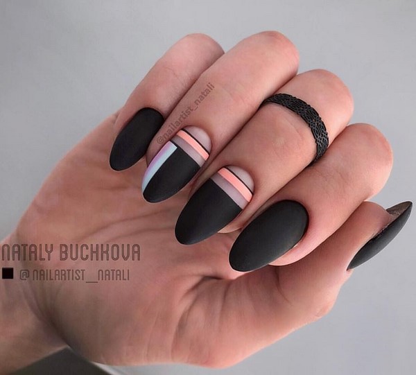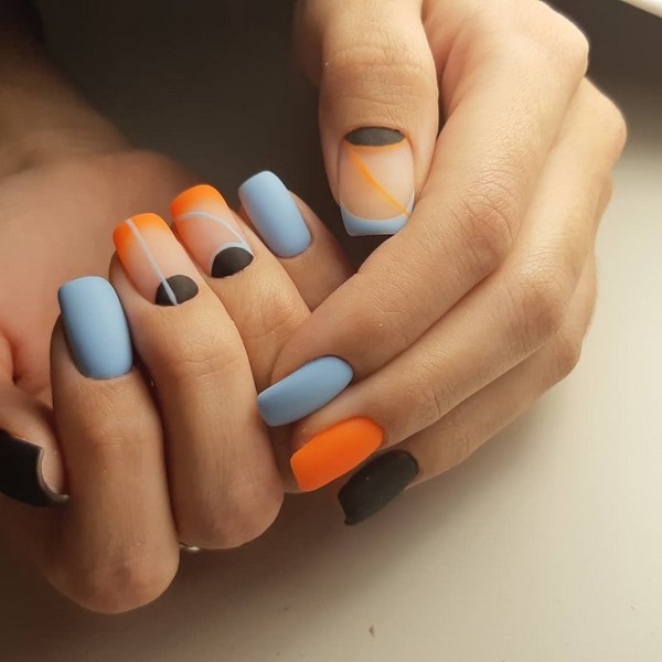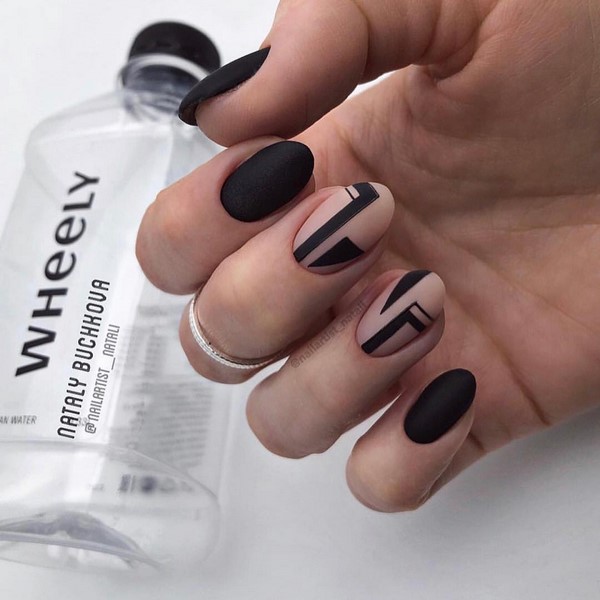 Un choix parfait pour toute longueur de soucis sera la géométrie dans une solution mate. Des rayures et des lignes multicolores, un «espace négatif» et des figures peuvent être appliqués simultanément sur tous les ongles ou en accentuant la matte manucure "géométrie"cela peut être une excellente solution même pour la soirée.