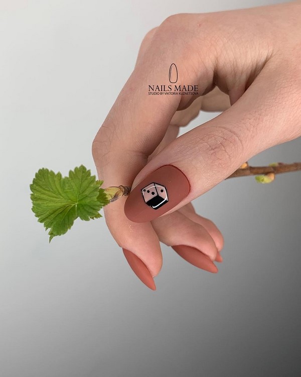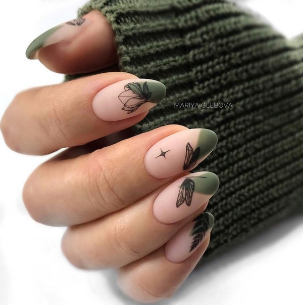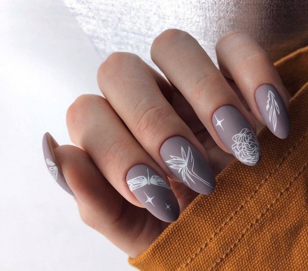 Il peut s’agir de motifs minimalistes, s’il s’agit du nail art mat quotidien, mais pour un motif romantique de manucure au fini mat, il vaut mieux choisir de beaux dessins floraux, des peintures avec des branches et des paysages.