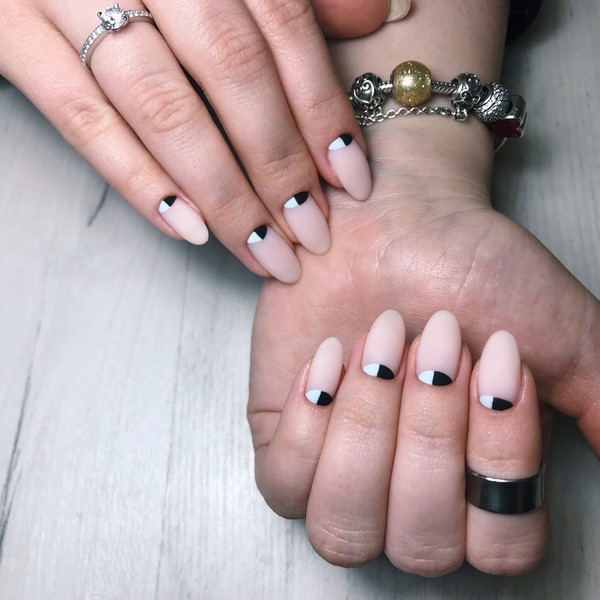 Pour ajouter de la concision à n’importe quel style de manucure - qu’il s’agisse de dessins complexes ou de manucure monochrome, la technique de «l’espace négatif» aidera, pendant laquelle une partie de l’ongle n’est pas remplie d’un revêtement de couleur et reste «ouverte». La manucure matte «espace négatif» à la mode donnera une allure chic avec des motifs géométriques, des manucures tendance «nues» ou «envahies», ainsi que des motifs floraux romantiques.
