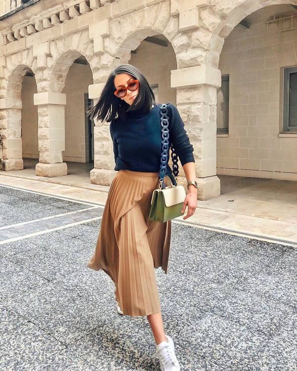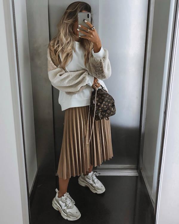 En revanche, les jupes à plis tendance sont incroyablement belles avec des chandails tricotés et des cols à col roulés, des pulls molletonnés et un sweat à capuche, des bottes brutes et des bottes hautes ainsi que des baskets à la mode. De tels noeuds superposés avec une jupe plissée seront parfaits pour tous les jours, pour les ensembles street style, sport chic et décontractés.