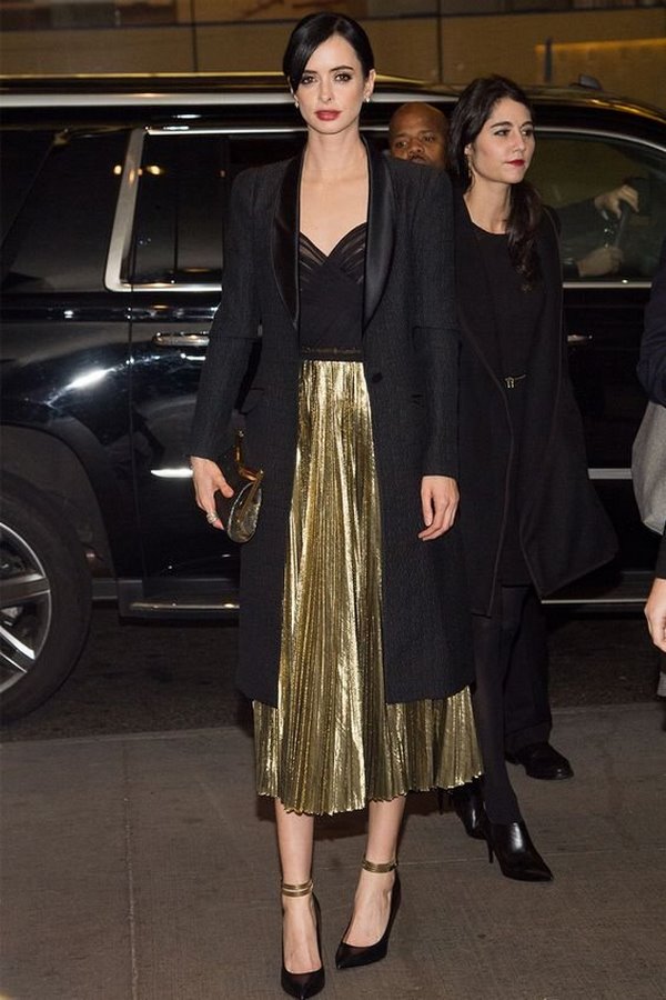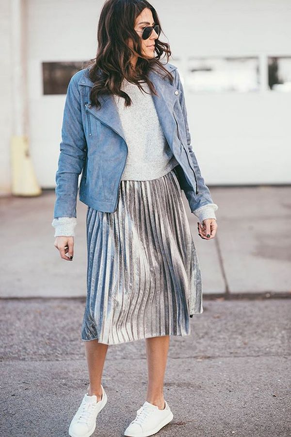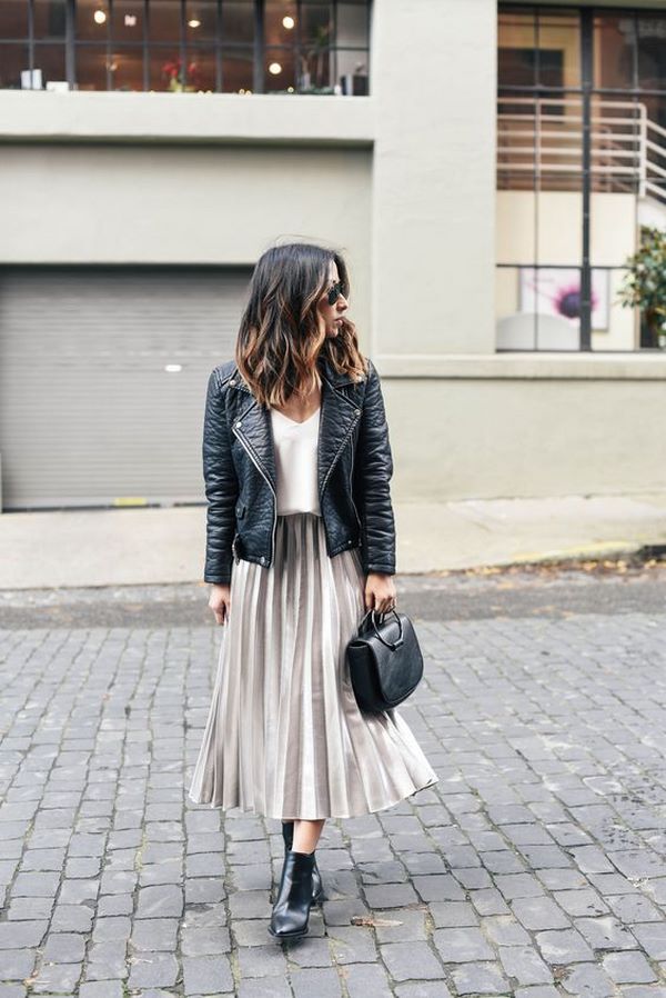 En tant que vêtement d'extérieur pour les jupes plissées à la mode, vous pouvez choisir des vestes en cuir, des vestes, des vestes ou des blousons aviateur. Des looks incroyables avec des vestes et des jeans, des blazers allongés et des trench-coat, complétant les jupes à plis du printemps et de l'automne.